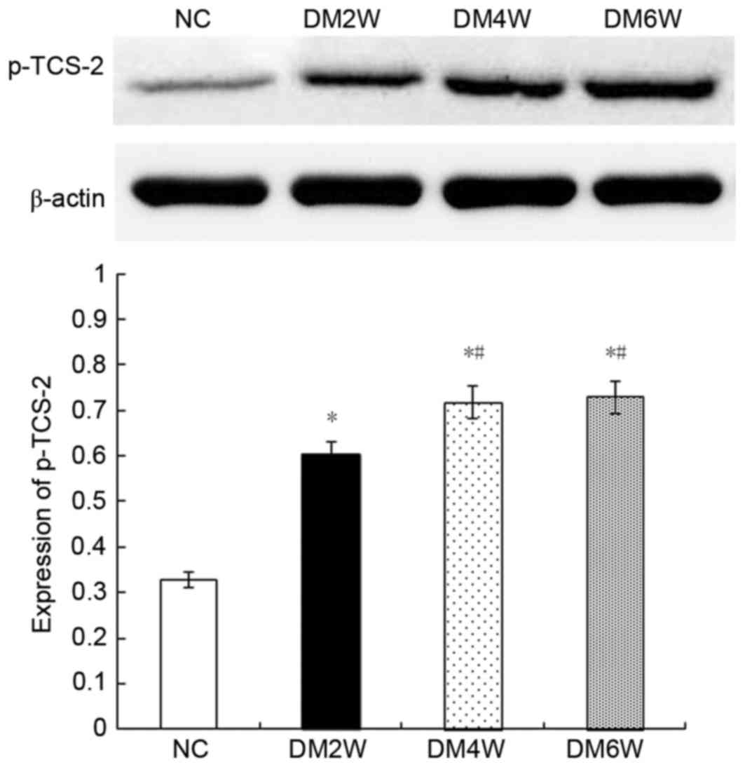 Relative protein expression of p-TCS-2Compared with the NC group (0.32±0.02), the expression levels of p-TCS-2 were higher in the DM2W (0.60±0.03), DM4W (0.72±0.02) and DM6W (0.73±0.04) groups (n=10; P<0.01). Compared with the DM2W group, the expression was increased in the DM4W group (n=10; P<0.01). No significant difference was observed between the DM4W and DM6W groups, as shown in Fig. 8.