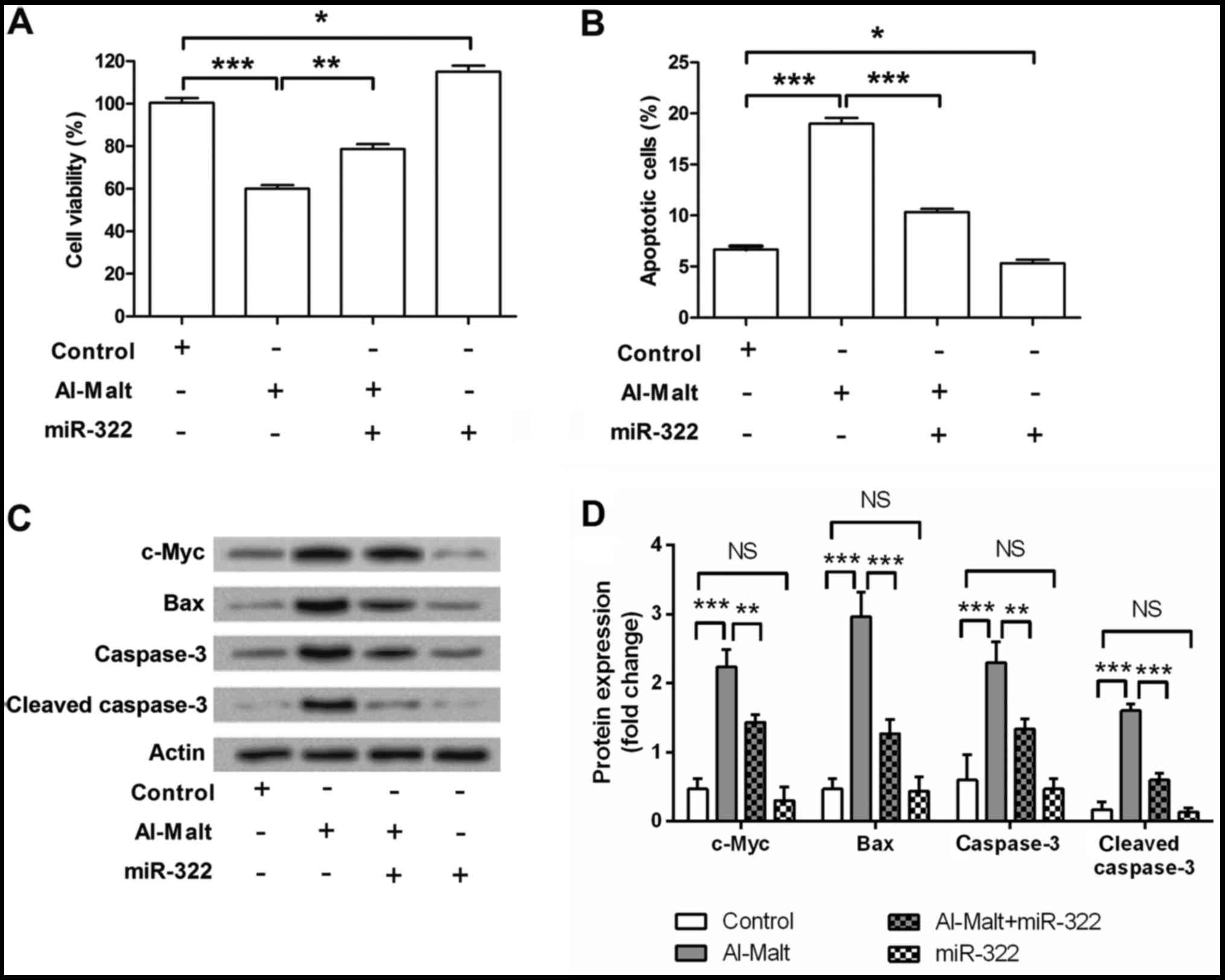 In conclusion, the present study is the first, to the best of our knowledge, to demonstrate that Al-Malt induced cell apoptosis by upregulating protein expression levels of c-Myc. miR-322 attenuates the apoptosis induced by Al-Malt, thus miR-322 may be involved in the pathogenesis of Al-Malt-associated AD.