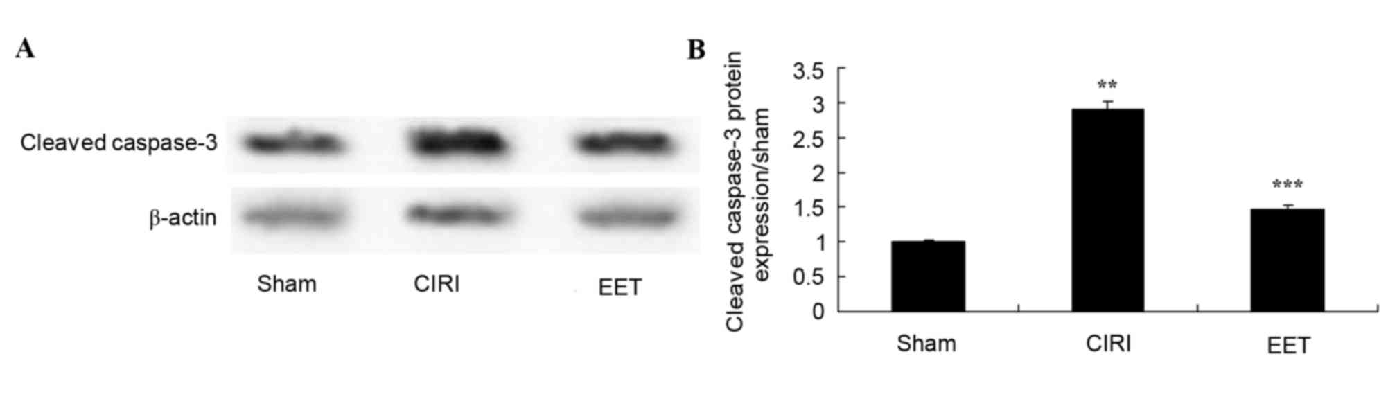 As assessed by western blot analysis (Fig. 4A), cleaved caspase-3 protein expression levels in CIRI tissue homogenates was significantly increased compared with the sham group. Pretreatment with EET significantly reduced CIRI-induced cleavedcaspase-3 protein expression levels (Fig. 4B).