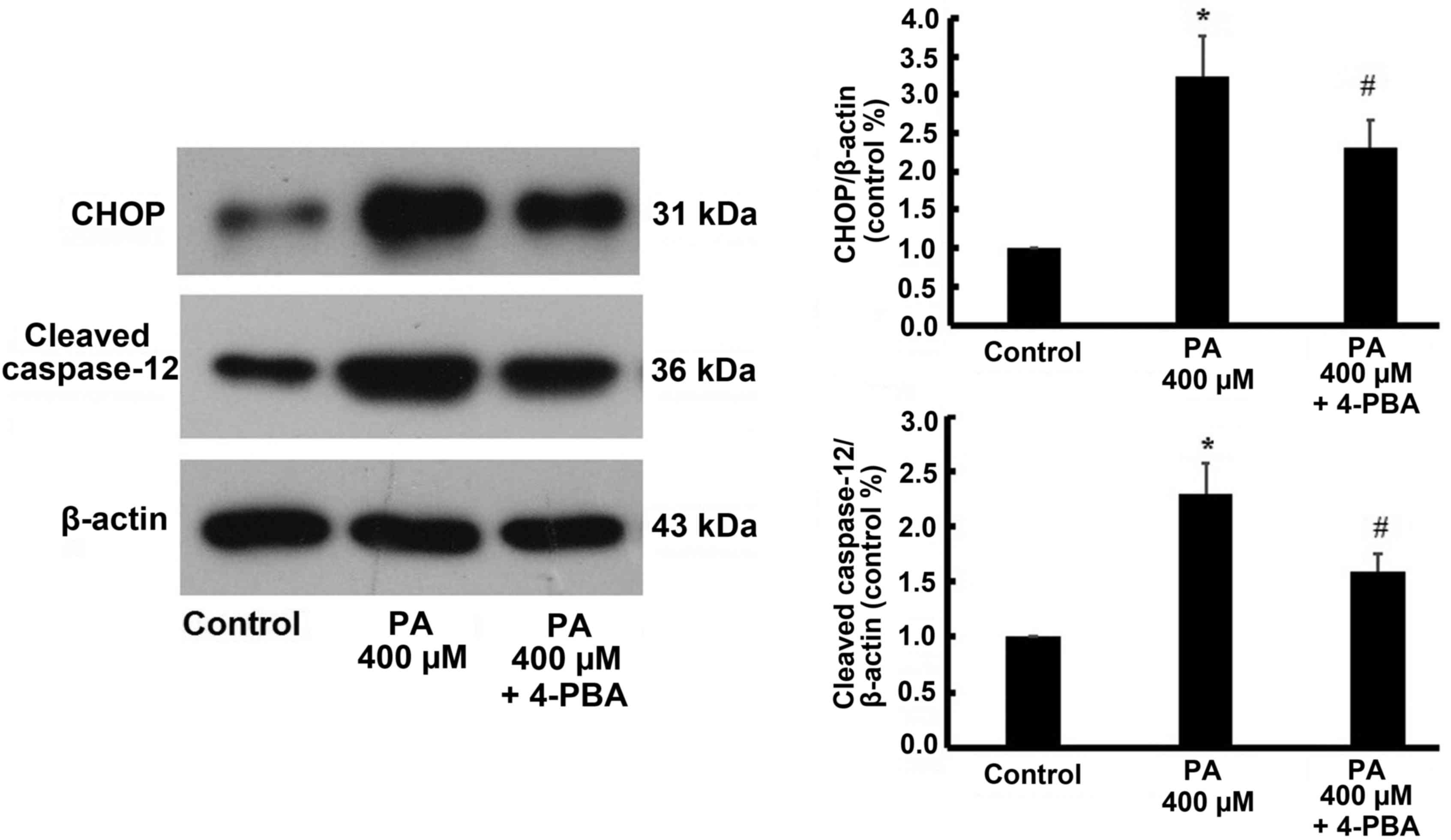 In order to reconfirm the role of ER stress in PA induced apoptosis, 4-PBA, a specific ER stress inhibitor, was administered to examine the changes in cell apoptosis rate and the expression of CHOP and cleaved caspase-12 following ER stress inhibition. The results revealed that 400 µM PA significantly increased H9c2 cells apoptosis rate, but this effect was reversed by treatment with 4-PBA (Fig. 7). Similarly, the expression of CHOP and cleaved caspase-12 were increased by 400 µM treatment, but were also reversed by 4-PBA treatment (Fig. 8).