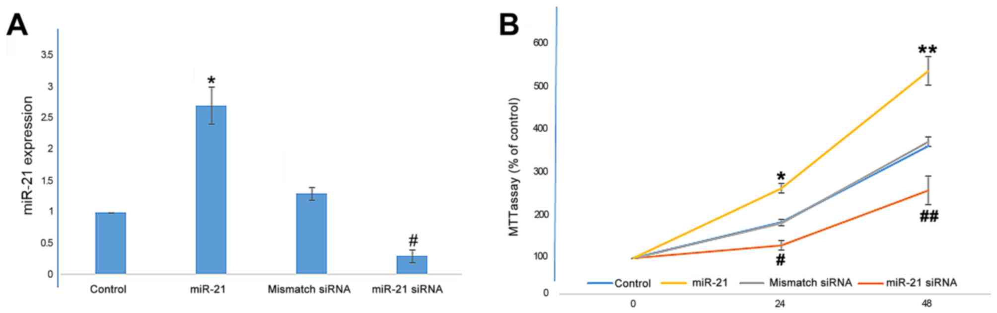 The mRNA expression of miR-21 is presented in Fig. 1A. The results demonstrated that miR-21 expression was significantly upregulated by miR-21 overexpression, but was downregulated by miR-21 suppression, compared with their corresponding controls (P<0.05). An MTT assay was used to determine the viability of A549 cells following 0, 24 and 48 h of transfection with miR-21, mismatch siRNA or miR-21 siRNA. The results presented in Fig. 1B demonstrated that overexpression of miR-21 significantly increased cell viability in A549 cells. However, the result was reversed by suppression of miR-21.
