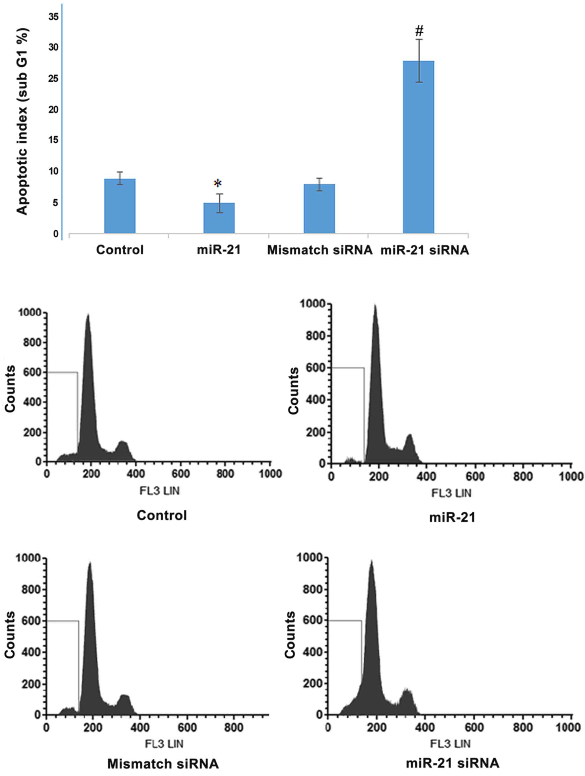 In the present study, miR-21 was overexpressed in A549 cells and cell viability was assayed following transfection with miR-21, mismatch siRNA or miR-21 siRNA. The results obtained in the MTT assay demonstrated that miR-21 was able to increase the viability of A549 cells. The apoptotic rate of A549 cells was investigated, and it was demonstrated that miR-21 increased viability by inhibiting cellular apoptosis.