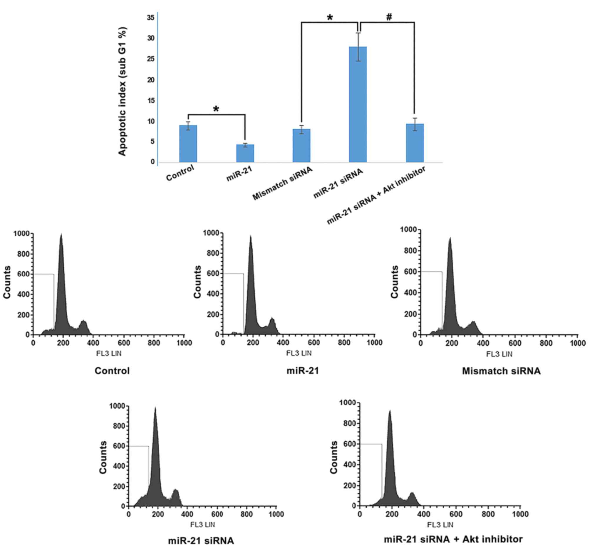The expression of Akt was inhibited and the apoptosis rate of the A549 cells was measured. The miR-21 siRNA + Akt inhibitor cells exhibited a decreased apoptotic rate compared with the miR-21 siRNA group, as presented in Fig. 4. The results demonstrated that the apoptotic rates of the A549 cells in the control, miR-21, mismatch siRNA, miR-21 siRNA and miR-21 siRNA + Akt inhibitor groups were 9, 4.3, 8, 28 and 9.3%, respectively. miR-21 overexpression significantly inhibited cell apoptosis compared with the control group, whereas miR-21 suppression promoted apoptosis as apoptosis was significantly increased compared with the mismatch siRNA group. However, the promoting effect of miR-21 suppression on cell apoptosis was abolished by treatment with an Akt inhibitor, as apoptosis was significantly reduced in the miR-21 siRNA + Akt inhibitor group compared with the miR-21 siRNA-only group. These results indicated that inhibition of Akt decreased the rate of apoptosis in A549 cells when miR-21 was suppressed.