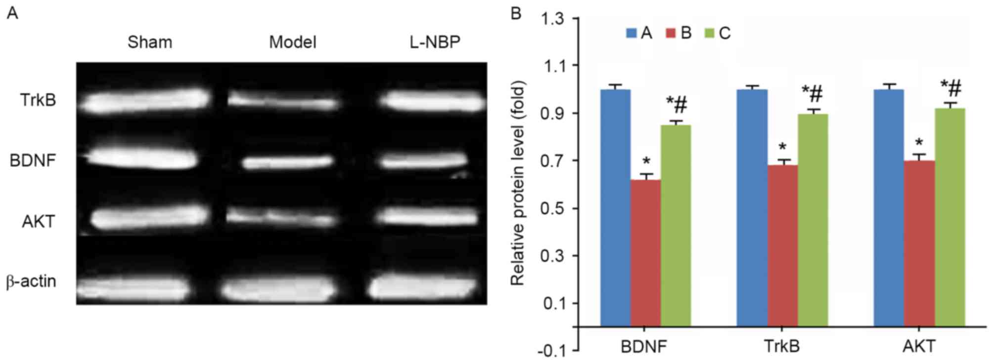 Brain-derived neurotrophic factor (BDNF)) is distributed in the central nervous system. During neural development, it improves the pathological status of neurons, facilitates their survival and differentiation, and protects against injury. It may additionally modulate neuronal functions via multiple signal transduction pathways. BDNF may affect learning and memory functions in a synergistic manner with the N-methyl-D-aspartate receptor (NMDAR) (11,12). Tyrosine kinase receptor B (TrkB) is important during neuronal differentiation, growth and development and may alleviate neuronal injury. Following brain ischemia, cell apoptosis is associated with signal pathways including phosphatidyl inositol-3/serine-threonine protein kinase (PI3K/Akt) and mitogen activated protein kinase, exerting a protective role (13,14). The present study established a rat VD model via bilateral ligation of common carotid arteries, and observed the effect of L-NBP on neurological functions and hippocampal BDNF and TrkB expression levels, in an attempt to investigate the underlying mechanism of the protective effects of L-NBP against VD.
