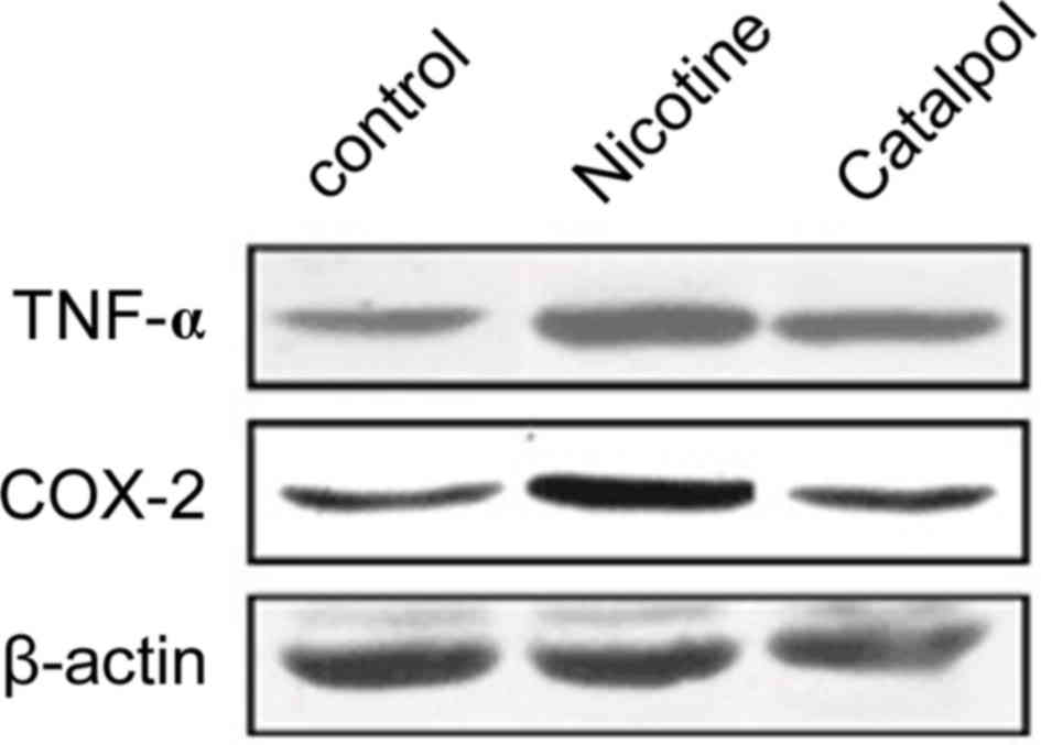 Western blotting was further employed to analyze the expression levels of TNF-α and COX-2 proteins in rat periodontal tissues. Results revealed significantly elevated protein levels of TNF-α and COX-2 after nicotine treatment compared with the control group (P<0.05; Figs. 6 and 7). Treatment with catalpol significantly decreased the protein levels in periodontal tissues compared with the nicotine group (P<0.05; Figs. 6 and 7).
