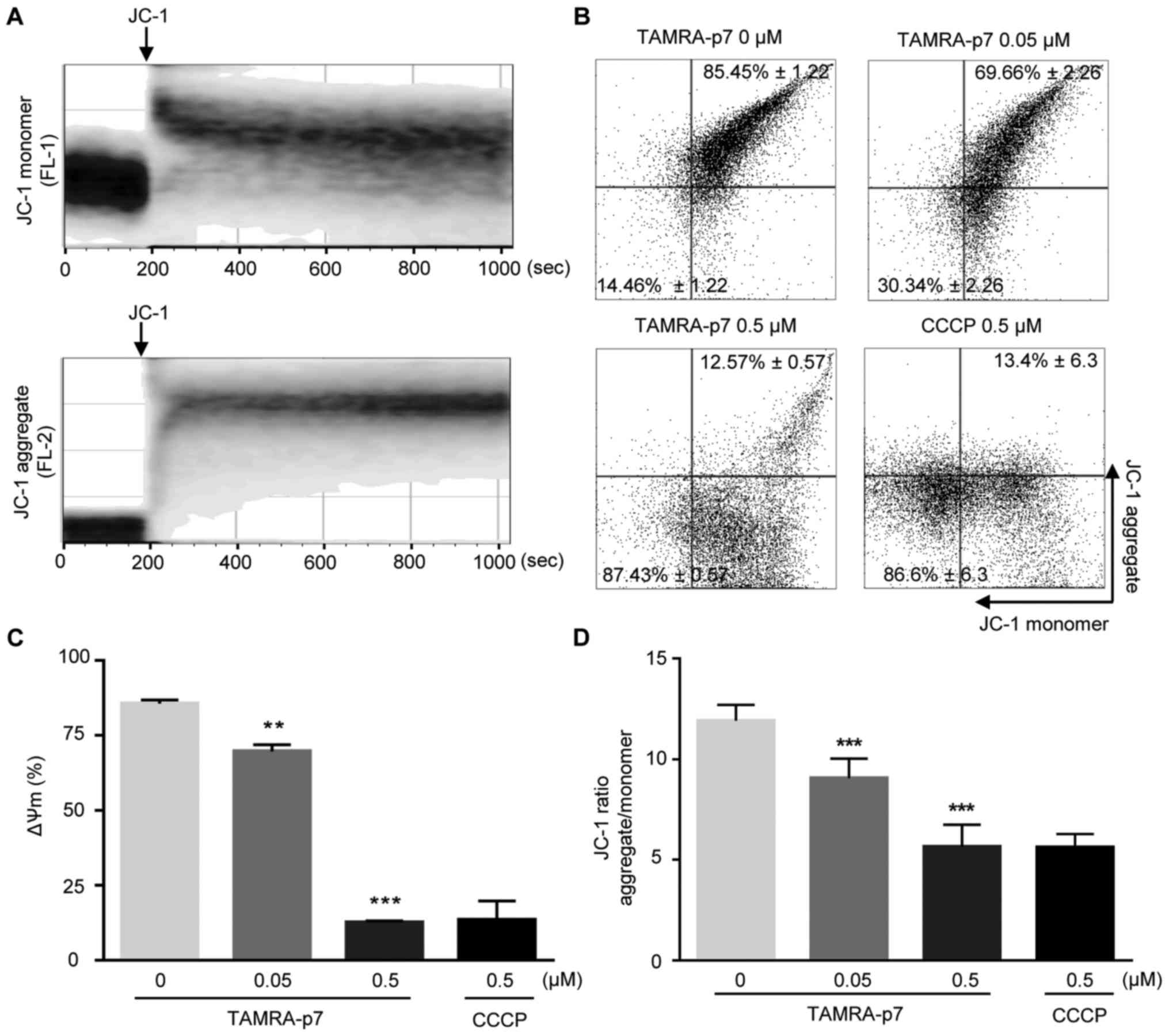 Mitochondrial samples were treated with p7 protein (1 µg/ml) for 5 min and then incubated with JC-1 (1 µM) for 10 min and transferred to black 96-well plates (Optiplate-96F; PerkinElmer, Inc., Waltham, MA, USA) for the measurement of fluorescence at 488 nm excitation. The fluorescence was detected at emission wavelengths of 525 nm (monomers) and 594 nm (aggregates). The mitochondrial membrane potentials were measured using a microplate reader (Molecular Devices, LLC, Sunnyvale, CA, USA).