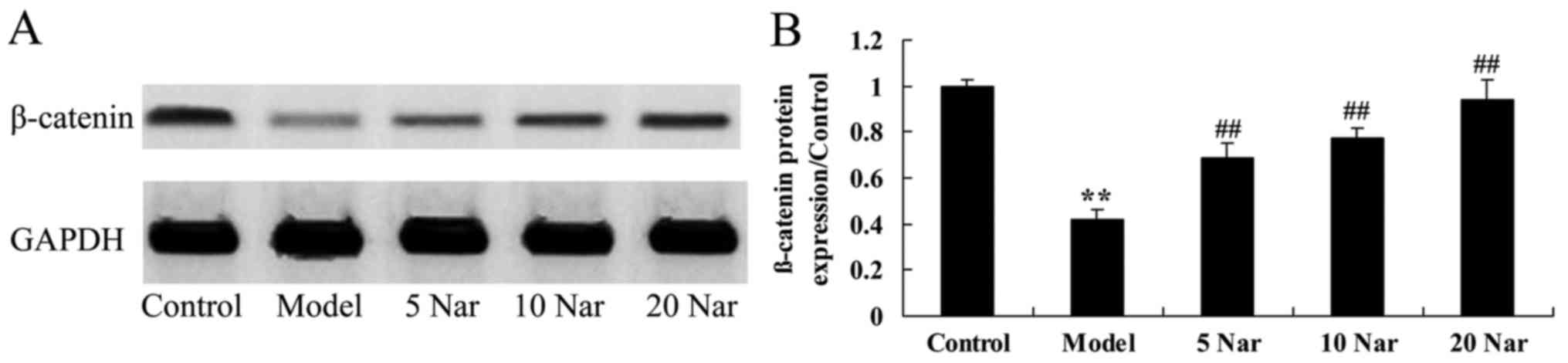 In the SANFH rabbit model group, β-catenin protein expression was significantly suppressed compared with the control group (Fig. 10). The inhibition of β-catenin protein expression in SANFH rabbit was significantly reversed by naringin, compared with the SANFH model group (Fig. 10).