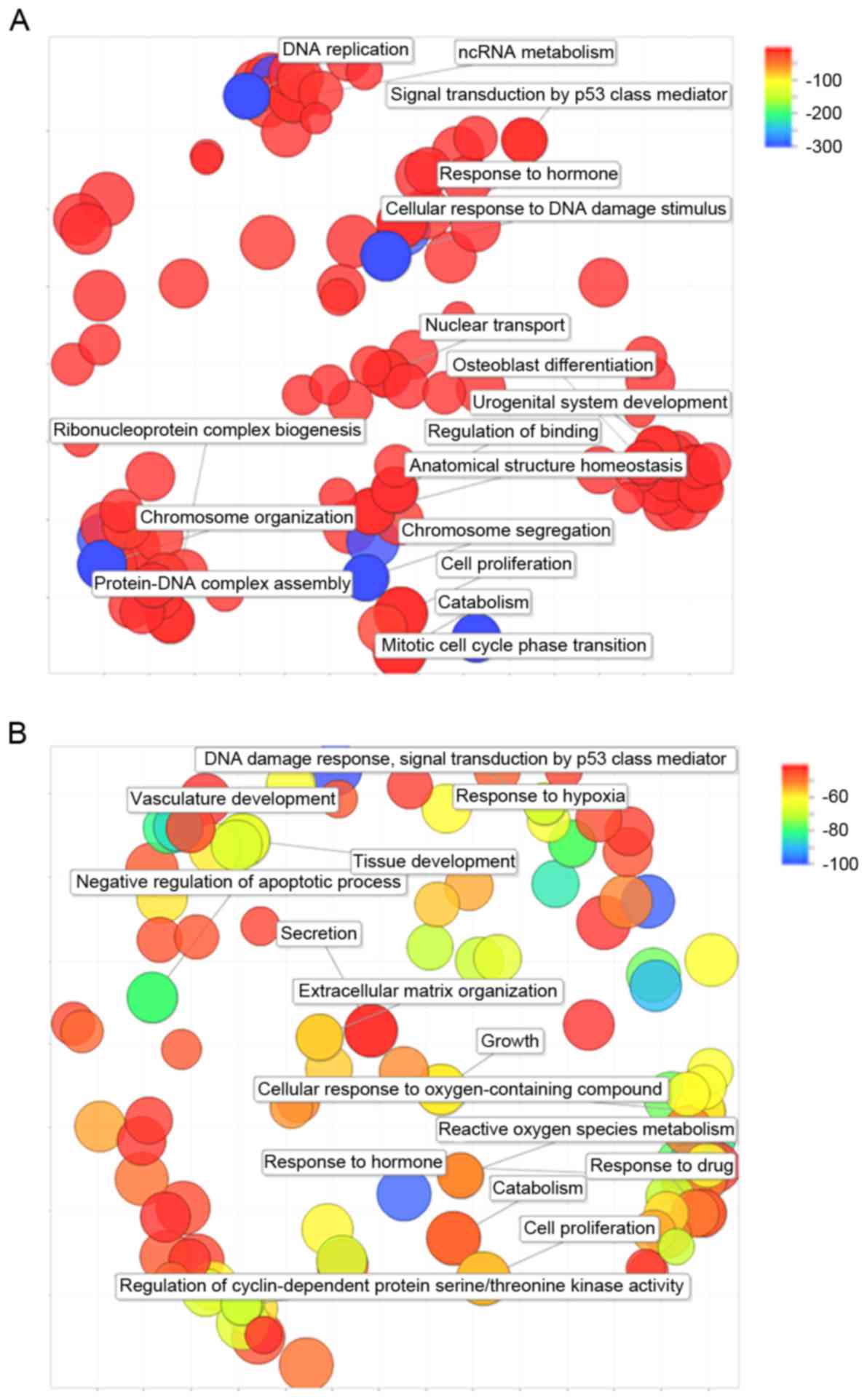 The 5 lists of DEGs that were identified in the EWS-FLI1-knockdown A673 cell lines were combined and the duplicates were removed, which resulted in 4,500 unique DEGs. A total of 635 biological process (BP) GO terms with minimum hits >5 were indicated to be significantly enriched in those genes. The 466 identified DEG-CPX DEGs were closely associated with 182 BP GO terms. The GO terms present level information based on GO database (http://amigo1.geneontology.org/cgi-bin/amigo/go.cgi) where the root terms, biological process, molecular function and cellular component, have level 1 and terms with higher level could indicate more specific function. It is helpful to remove redundant information for the interpretation of enriched functions. For this purpose, the full lists of BP GO terms were submitted to REVIGO online tool to refine the enriched functions of DEGs. As a result, the 4,500 EWS-FLI1-knockdown DEGs are revealed to be closely associated with BPs that are related to cell activity, chromosome structure and DNA replication (Fig. 3A). The 466 DEG-CPXDEGs are closely associated with vasculature development, cell activity and response to drug (Fig. 3B).