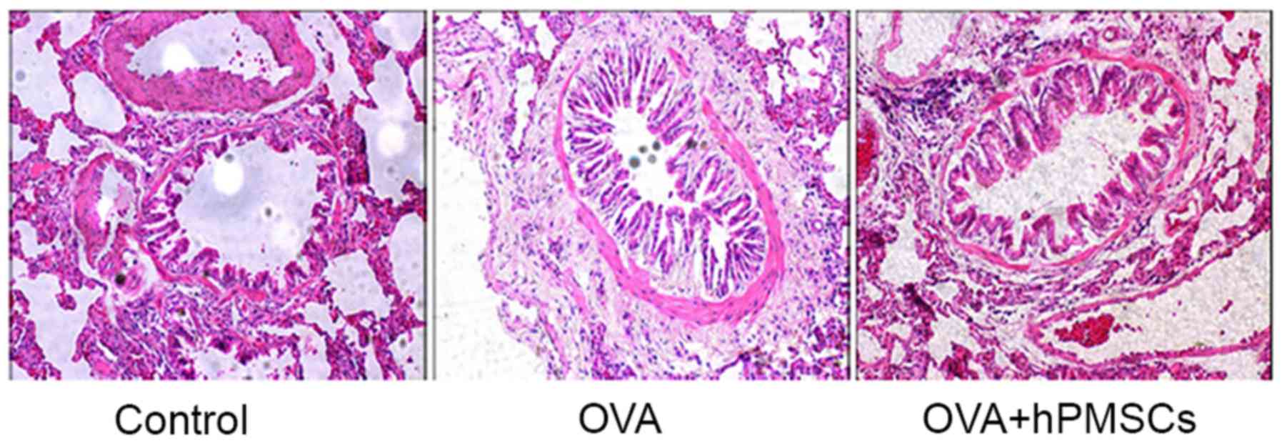 The cells in the BALF collected from controls, OVA- and hPMSC-treated rats were counted on a hemocytometer. The total number of cells and the number of eosinophils were both significantly greater in the OVA group compared with the OVA + hPMSCs and control groups; these counts were also greater in the OVA + hPMSCs group in the OVA group (Fig. 2). Histological evaluation revealed inflammatory alterations in the bronchial tissue of rats in the OVA group, including inflammatory cell infiltration of the trachea, and surrounding perivascular tissue and subepithelial smooth muscle, along with luminal narrowing. The asthma model was thus successfully established. The inflammatory alterations were significantly reduced in the OVA + hPMSCs group compared with the OVA group. Inflammatory cell infiltration and goblet cell hyperplasia were reduced, mucus secretion was downregulated, and airway smooth muscle proliferation was attenuated. Only slight luminal narrowing was apparent, and only occasional alveolar inflammatory cells were observed (Fig. 3). hPMSCs were thus demonstrated to alleviate the development of asthma, reducing OVA-induced bronchial airway inflammation, cell infiltration and mucin production.
