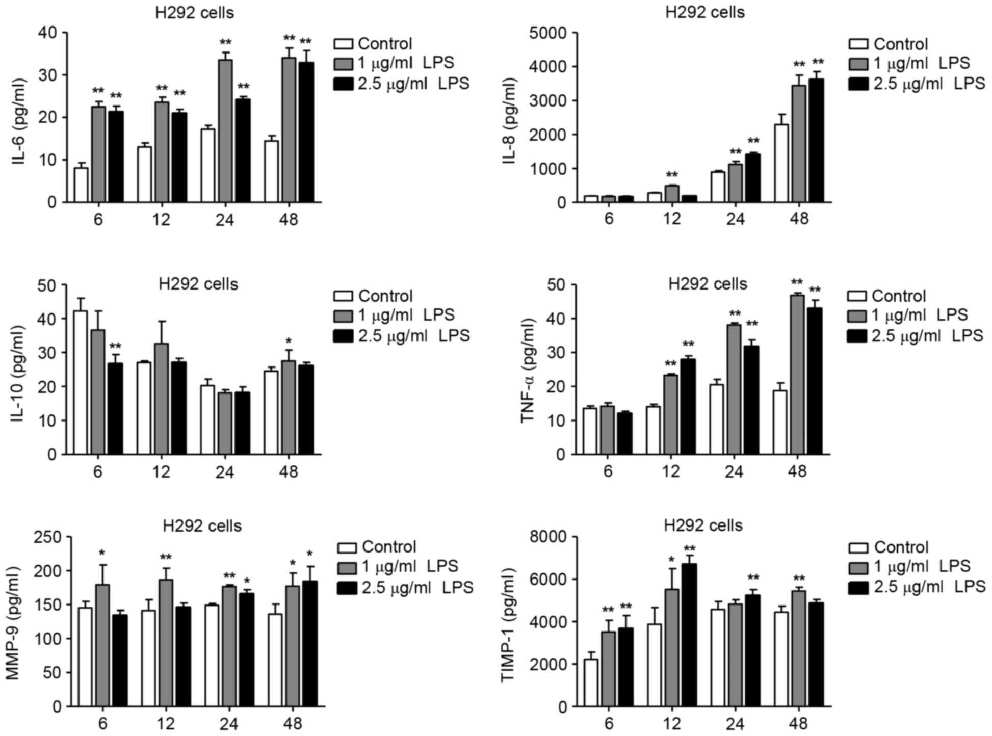 LPS is a potent proinflammatory activator of monocytes and macrophages in vivo and in vitro (3,12). In the present study, H292 and differentiated THP-1 cells were exposed to different concentrations of LPS for 6, 12, 24 and 48 h, then the expression levels of IL-6, −8, −10, TNF-α, MMP-9 and TIMP-1 were detected by ELISA. Compared with untreated H292 cells, treatment with 1 and 2.5 µg/ml LPS resulted in increased levels of IL-6, −8, TNF-α, MMP-9 and TIMP-1 (Fig. 2). IL-10 levels in the LPS-treated H292 cells, however, were not significantly altered (Fig. 2). In differentiated THP-1 cells, stimulation with 1 and 2 µg/ml LPS resulted in an increase of IL-6, −8 and TNF-α levels compared with control (Fig. 3). However, the expression levels of IL-10, MMP-9 and TIMP-1 were not significantly altered in THP-1 cells following LPS stimulation (Fig. 3). These results demonstrated that LPS could induce IL-6, −8, and TNF-α expression in both the H292 and THP-1 cells. In addition, LPS treatment significantly increased the expression levels of MMP-9 and TIMP-1 in H292 cells, but not in differentiated THP-1 cells. Taken together, these data suggest that LPS stimulation had the different effects on cytokine expression profiles in H292 and differentiated THP-1 cells, and this may be related to differences in the physiological characteristics of these two cell types. H292 cells have characteristics similar to those of alveolar and bronchiolar epithelial cells and are widely used in alveolar and bronchiolar epithelial models, and the gene expression profile of H292 cells is similar to that of primary nasal epithelial cells from healthy human controls (13). THP-1 cells, a human leukemia-derived monocytic cell line, is the most commonly used cellular model for investigating human macrophage function (12).