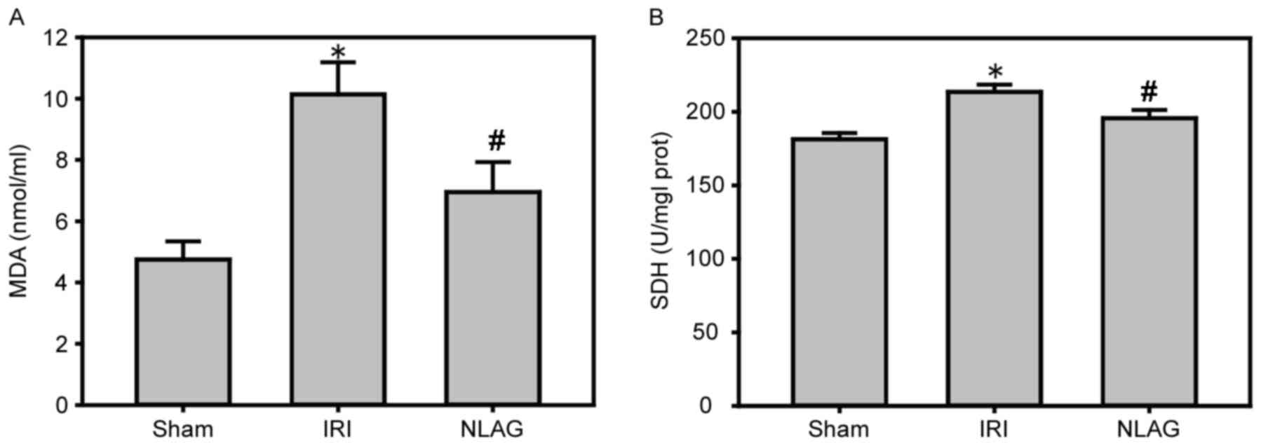 Compared with the Sham group, the protein expression levels of MDA and SDH were increased in the IRI group (P<0.05). However, NLAG effectively inhibited the expression of the oxidative stress indicators, which was statistically significant compared with the IRI group (P<0.05, Fig. 5).