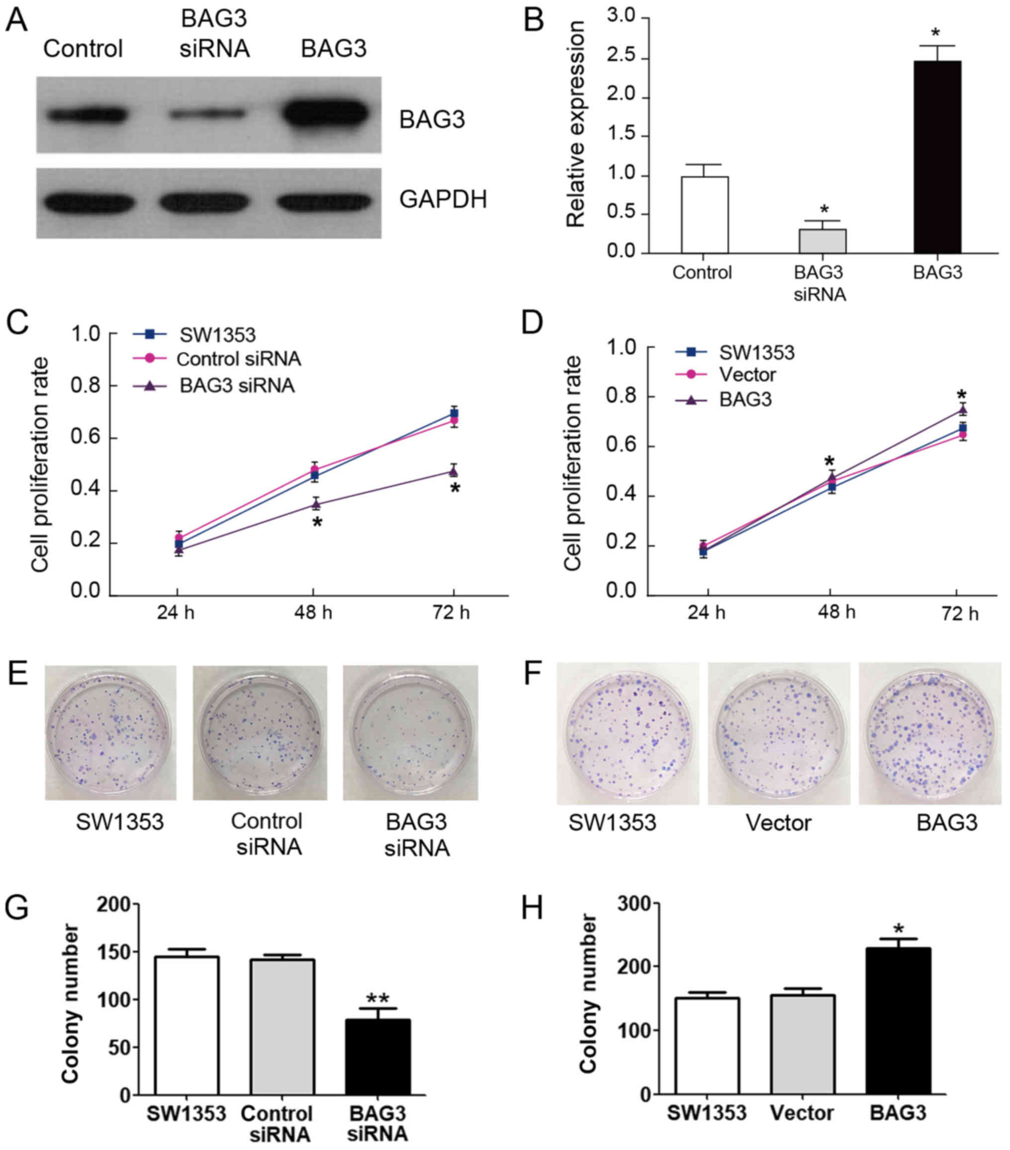 SW1353 cells were transfected with either control siRNA, siBAG3 or overexpression vector of BAG3 for 48 h, 1×103 cells were seeded on 10 cm dish with regular cell culture medium for two weeks and the colonies were stained with gentian violet after methanol fixation, and visible colonies (>50 cells) were counted. Colonies from randomly-selected image areas of three replicate wells were enumerated.