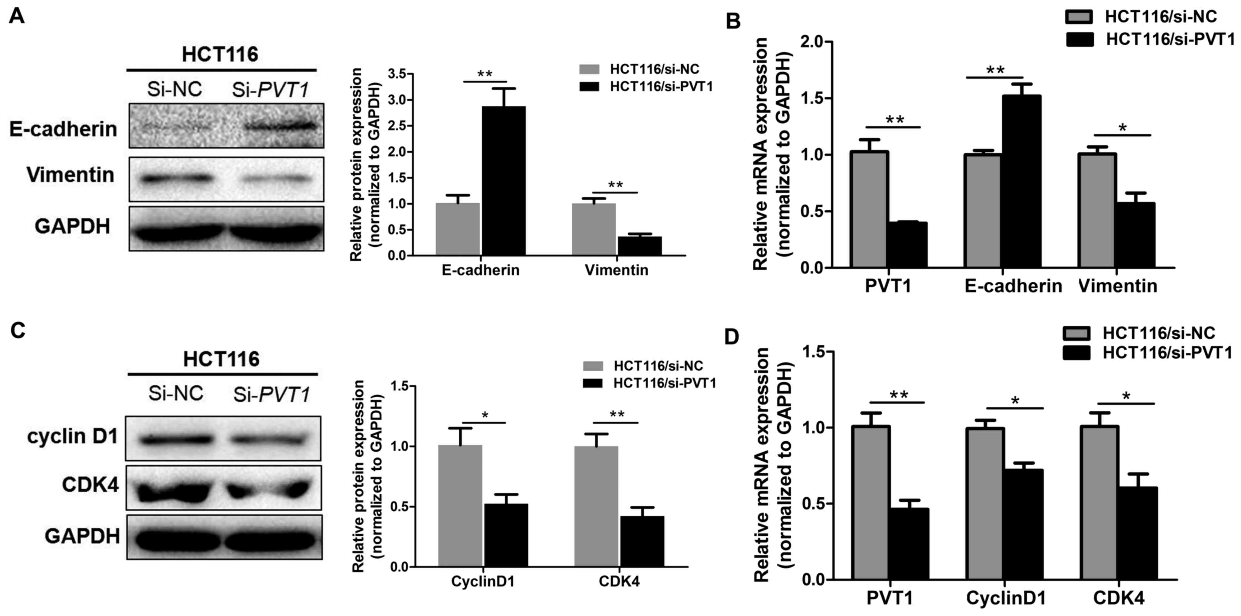 To confirm that PVT1 knockdown suppresses the proliferation, invasion, and metastasis of CRC cells in vitro, RT-qPCR and western blotting were used to assess the mRNA and protein level of the epithelial marker E-cadherin, mesenchymal markers vimentin, and proliferation markers cyclin D1 and CDK4 in HCT116 cell lines. PVT1 knockdown significantly decreased vimentin and enhanced E-cadherin expression (P<0.05, Fig. 5A-B), thereby inhibiting the progression of EMT. Meanwhile, PVT1 knockdown significantly inhibited cyclin D1 and CDK4 (P<0.01, Fig. 5C and D). This indicates that PVT1 regulates proliferation and EMT markers expression in CRC cell lines.