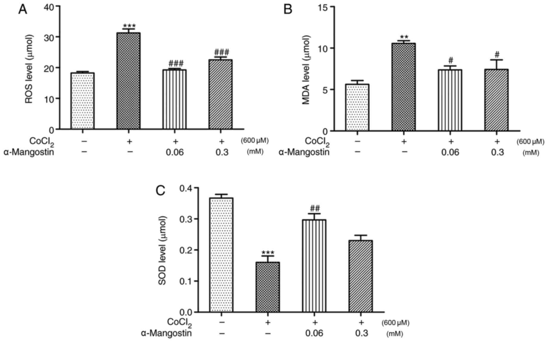 Hypoxia may induce ROS generation and lipid peroxidation (38). ROS, a series of cellular molecules generated during oxygen metabolism, are generally considered to be important mediators of oxidative stress injury (39). The MDA concentration frequently reflects the degree of lipid peroxidation, indirectly reflecting the degree of cellular oxidative injury (40). SOD decrease cellular free oxygen radicals (41). The present study demonstrated that the ROS level and MDA concentration were increased in H9C2 cells treated with CoCl2, while the activity of SOD was suppressed. In H9C2 cells treated with α-MG, the results were reversed, demonstrating the antioxidant effects of α-MG, which coincide with the observations in vivo.