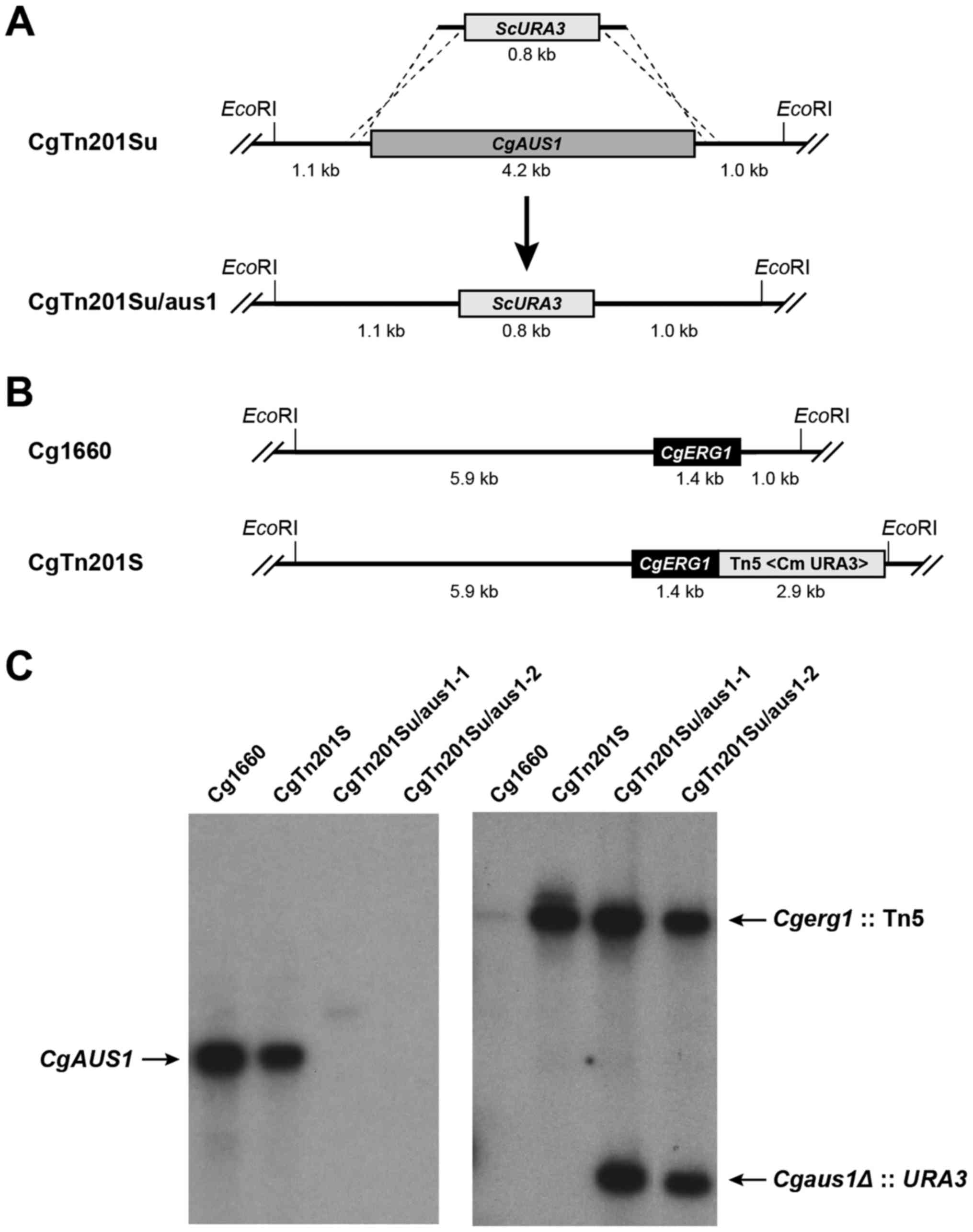 The Cgerg1 mutant was generated in our laboratory as described previously (8). Gene deletion of Cgaus1 was performed as described by Vermitsky et al (12). Briefly, the primer pair CgAUS1D1S (TTGAAATTCTCGGAAAGAAACATCAAATCAAAAAATTTTAACCTTCTAAAACTTGTTCTTTTTTTGGGAAATATAAGATGTCGAAAGCTACATATAAGGA) and CgAUS1D2AS (AGTAGATTAAAGAAAAGTGTTAAATTTAAGAATAAAATGGAATTGTTATTTCATTAAAAGCTTGTAGGAGTCACTCTTATTAGTTTTGCTGGCCGCATCT) was used to generate the CgAUS1 deletion cassette using YEP24 as the template to amplify Saccharomyces cerevisiae URA3, which served as the selection marker. An additional round of PCR using the primer pair CgAUS1D3S (CCCCAACTATCAATTTTCTTTAAATCAAGGAAAATCTATTACATTCGCTATTAATCTCTACTATCTTTATCTTAGTTTTTTGAAATTCTCGGAAAGAAAC) and CgAUS1D4AS (ATTATATTTTAAATTTTGTTGTATAGCTTTTTTGCTGTAAAGGTGAAAAAACCGGGAATTTTGAGCATTAGTATTAGTAGATTAAAGAAAAGTGTTAAAT) extended the 5′ and 3′ ends with about a 160 bp homologous region on each end of the CgAUS1 deletion cassettes to increase the efficiency of homologous recombination. S. cerevisiae URA3 was transformed into CgTn201Su (Cgura3 Cgerg1::Tn5<Cm ura3>) to construct the Cgerg1/aus1 double mutant CgTn201Su/aus1 via a successful double crossover homologous recombination, which resulted in replacement of the CgAUS1 ORF with S. cerevisiae URA3 (Fig. 1A). The CgERG1 locus in the clinical isolate Cg1660 and its transposon mutant CgTn201S (Cgerg1) are shown in Fig. 1B. Transformants were selected on MIN medium, and the deletion of CgAUS1 was confirmed by Southern blot analysis of the EcoRI-digested genomic DNA (Fig. 1C). The purified 1.2-kb ScURA3 probe detected a single signal in the Cgerg1 mutant CgTn201S; two signals were detected in the two putative Cgerg1/aus1 mutants CgTn201Su/aus1-1 and CgTn201Su/aus1-2, while there was no signal in the parental strain Cg1660 (Fig. 1C, right panel). The 1087-bp CgAUS1 probe detected a single 6.3-kb signal in Cg1660 and CgTn201S, but not in the two putative Cgerg1/aus1 mutants CgTn201Su/aus1-1 and CgTn201Su/aus1-2 (Fig. 1C, left panel).