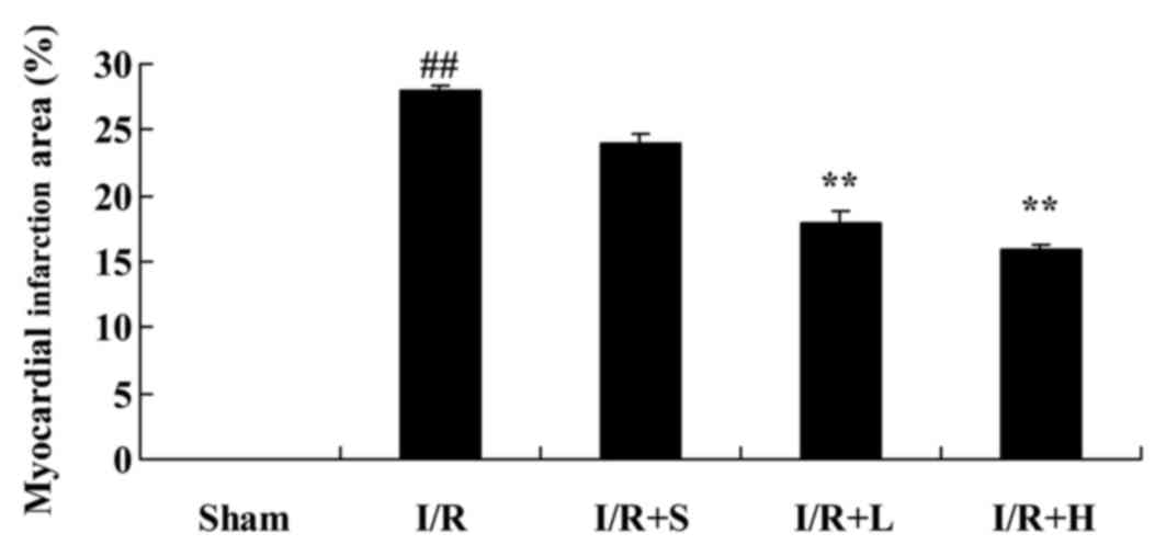 Male Sprague-Dawley rats (8–10 weeks old, n=40) weighing 200–220 g were housed at 22–23°C, 55–60% humidity, 12 h light/dark cycle and access free to food and water, and randomly assigned into five groups: Sham (n=6); ischemia/reperfusion (I/R; n=10); I/R+L (lower dosage, n=8, 25 mg/kg puerarin); I/R+M (medium dosage, n=8, 50 mg/kg puerarin), I/R+H (higher dosage, n=8, 100 mg/kg puerarin). Rats were injected intraperitoneally with streptozotocin (30 mg/kg) twice, with a rest day between each injection. The following week, the myocardial I/R model was induced with 35 mg/kg pentobarbital sodium; the heart was exteriorized with a left thoracic incision, and a slipknot made using 4-0 silk was placed around the left anterior descending coronary artery. Ischemia was performed for 30 min, the slipknot was released and reperfusion was allowed to occur for 3 h. Rats of the sham group were anesthetized with 35 mg/kg pentobarbital sodium and underwent a sham surgery in which the heart was exteriorized without myocardial I/R. The following day, myocardial I/R rats were gavaged with 25, 50 or 100 mg/kg/puerarin (Sigma-Aldrich; Merck KGaA, Darmstadt, Germany) every 2 days over 4 weeks. The present study was approved by the ethics committee of Tianjin First Central Hospital (Tianjin, China).