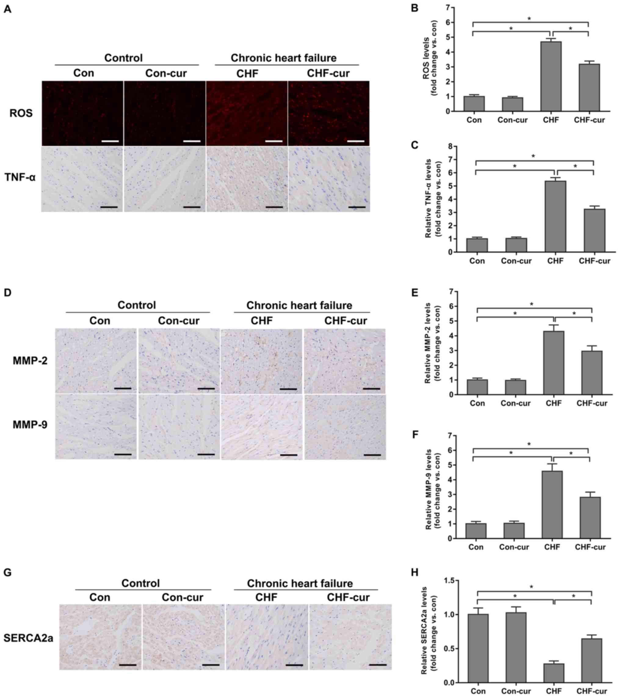 Curcumin was demonstrated to improve cardiac function and inhibit heart remodeling. The effects of curcumin on the biomarkers above, including ROS, TNF-α, MMP-2 and MMP-9, were investigated. In the sample images of DHE staining, red granules in cytoplasm and cell nucleus indicated positive staining of ROS (Fig. 2A ROS) and yellow granules in cytoplasm indicated the positive staining of the target proteins in the sample images of immunohistochemical staining (Fig. 2A TNF-α, 2D MMP-2, 2D MMP-9 and 2G SERCA2a). Quantitative analysis of the DHE staining and immunohistochemical staining indicated that expression of ROS, TNF-α, MMP-2 and MMP-9 were increased in the CHF group compared with the Con group but these proteins were decreased in the CHF-cur group (Fig. 2A-F). Compared with the Con group, the expression of SERCA2a decreased in the CHF group, and curcumin increased its expression in the CHF-cur group (Fig. 2G and H).