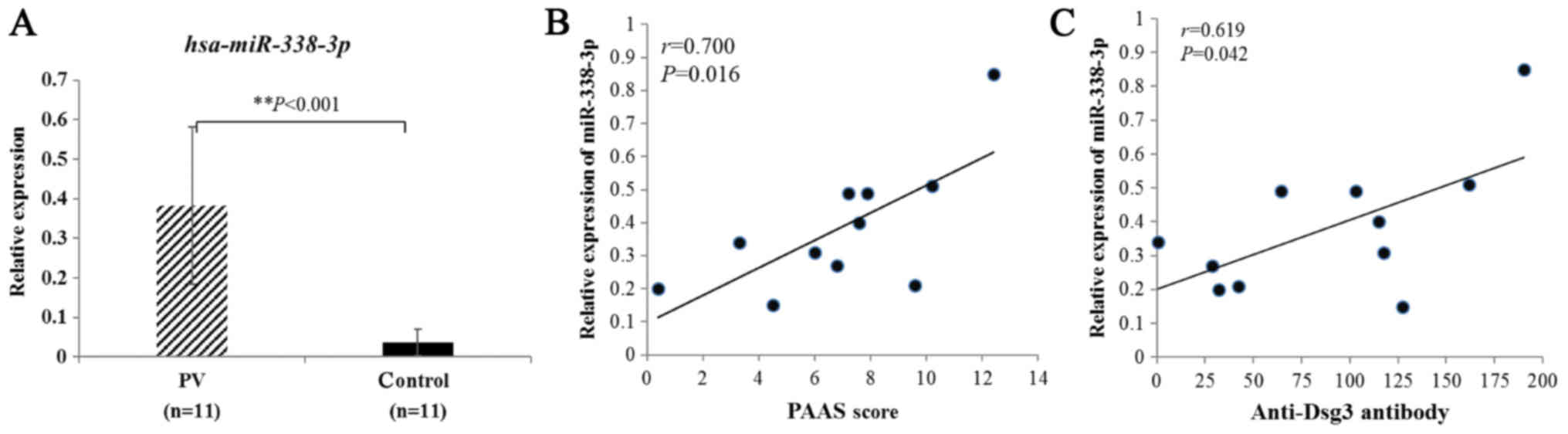 SPSS 21.0 software was used for all statistical analyses. The data were presented as means ± standard deviation (SD). Group comparisons were analyzed by Student's t-test or a one-way analysis of variance (ANOVA) followed by LSD test. Pearson method was used to analyze the correlation between mikR-338-3p and PAAS or anti-Dsg3 antibody. A value of P<0.05 was considered statistically significant.