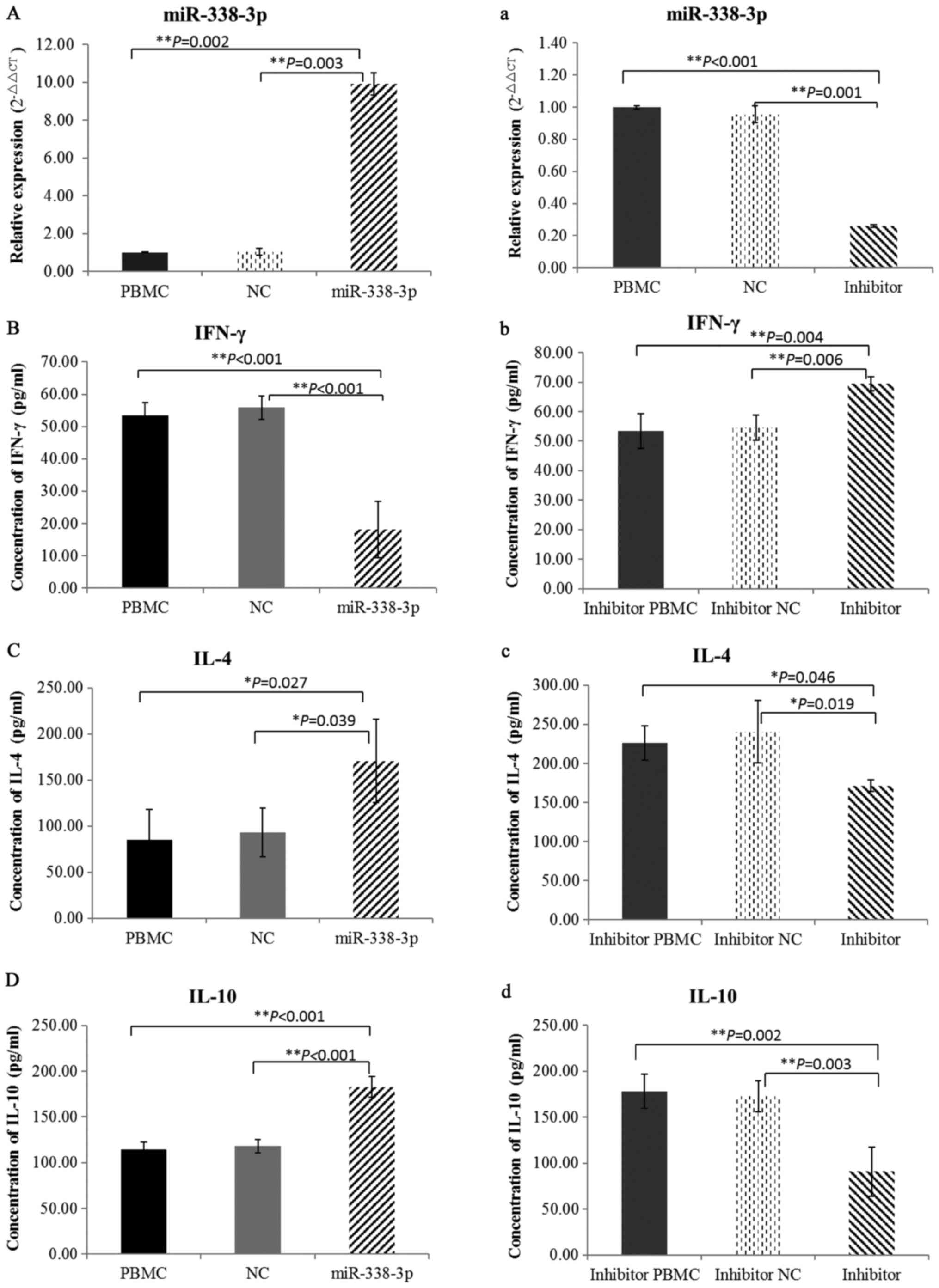 To examine the levels of T lymphocyte cytokines, we detected IFN-γ, IL-4 and IL-10 by ELISA. miR-388-3p overexpression in cultured PBMCs from healthy individuals lead to significantly decreased levels of IFN-γ (Fig. 2B) and the Th2 cytokines, IL-4 and IL-10, were markedly increased (Fig. 2C and D). However, when miR-388-3p was inhibited in cultured PBMCs from patients, opposing findings were observed (Fig. 2b-d). Taken together, these results suggested that miR-338-3p could regulate the balance of Th1/Th2 cells in PV patients.