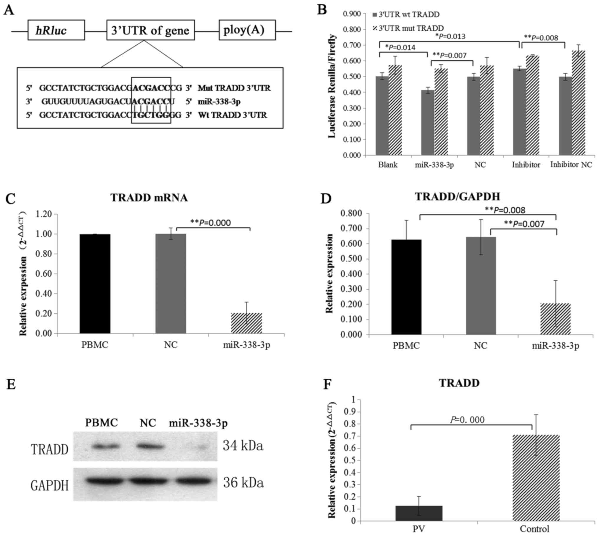 The changes of TRADD protein expression were detected when miR-338-3p was overexpressed in vitro. The levels of TRADD mRNA and protein were found to be significantly lower in the miR-338-3p group compared with PBMC group and control group (Fig. 4C-E). We also examined the expression of TRADD in vivo. We found that mRNA expression of TRADD was decreased in PV patients when miR-338-3p was overexpressed (Fig. 4F). Altogether, these findings suggested that miR-338-3p directly targets TRADD in PV.