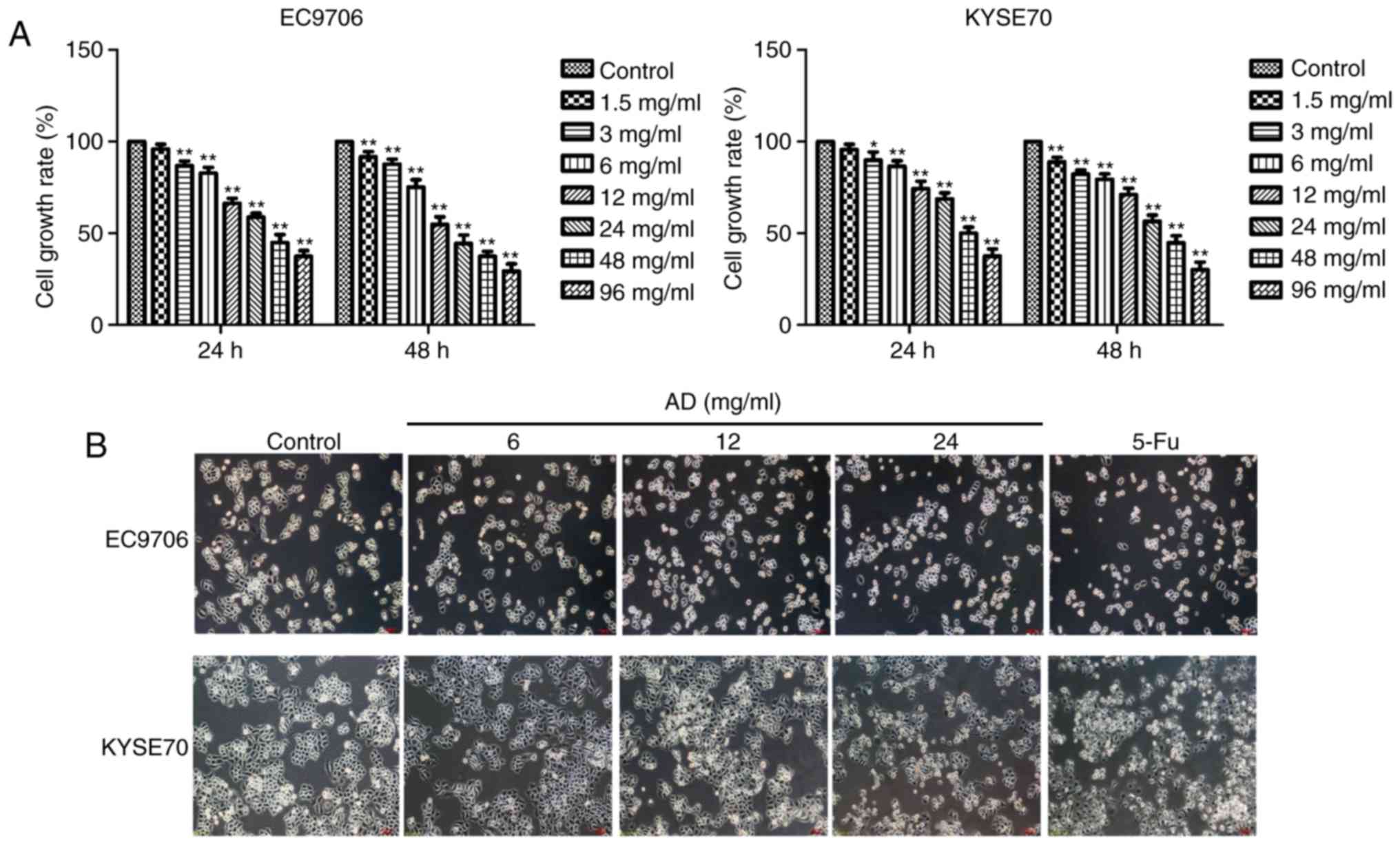 EC9706 and KYSE70 cells treated with varying concentrations (3, 6, 12, 24, 48 or 96 mg/ml) of Aidi for 24 or 48 h revealed significantly inhibited growth (P<0.05, P<0.01; Fig. 1A) in a concentration and time-dependent manner. The cell growth rates of EC9706 for 24 h were 1.5 mg/ml (95.95±2.67%), 3 mg/ml (86.79±2.64%), 6 mg/ml (82.76±3.10%), 12 mg/ml (66.27±2.74%), 24 mg/ml (58.84±2.12%), 48 mg/ml (44.99±4.29%), 96 mg/ml (37.44±3.07%), respectively. The cell growth rates of KYSE70 for 24 h were 1.5 mg/ml (95.68±2.91%), 3 mg/ml (89.95±4.34%), 6 mg/ml (86.61±2.94%), 12 mg/ml (74.36±4.07%), 24 mg/ml (68.65±3.41%), 48 mg/ml (50.11±3.24%), 96 mg/ml (39.57±3.87%), respectively. The half maximal inhibitory concentration at 24 h for EC9706 and KYSE70 cells was 25.89 mg/ml and 32.58 mg/ml, respectively. Aidi was administered via intravenous injection once a day, so 24 h treatment was selected and Aidi concentrations of 6, 12 and 24 mg/ml which growth inhibition rate was <50% were used to avoid cytotoxic effects of excessive concentration in subsequent experiments; 32 mg/ml 5-Fu was used as a control. The morphological characteristics of the cells were observed following the selected treatments. The intercellular space increased, cell numbers were reduced and the cytoplasm shrank in response to Aidi and 5-Fu treatments compared with in the control group of the two cell lines (Fig. 1B).