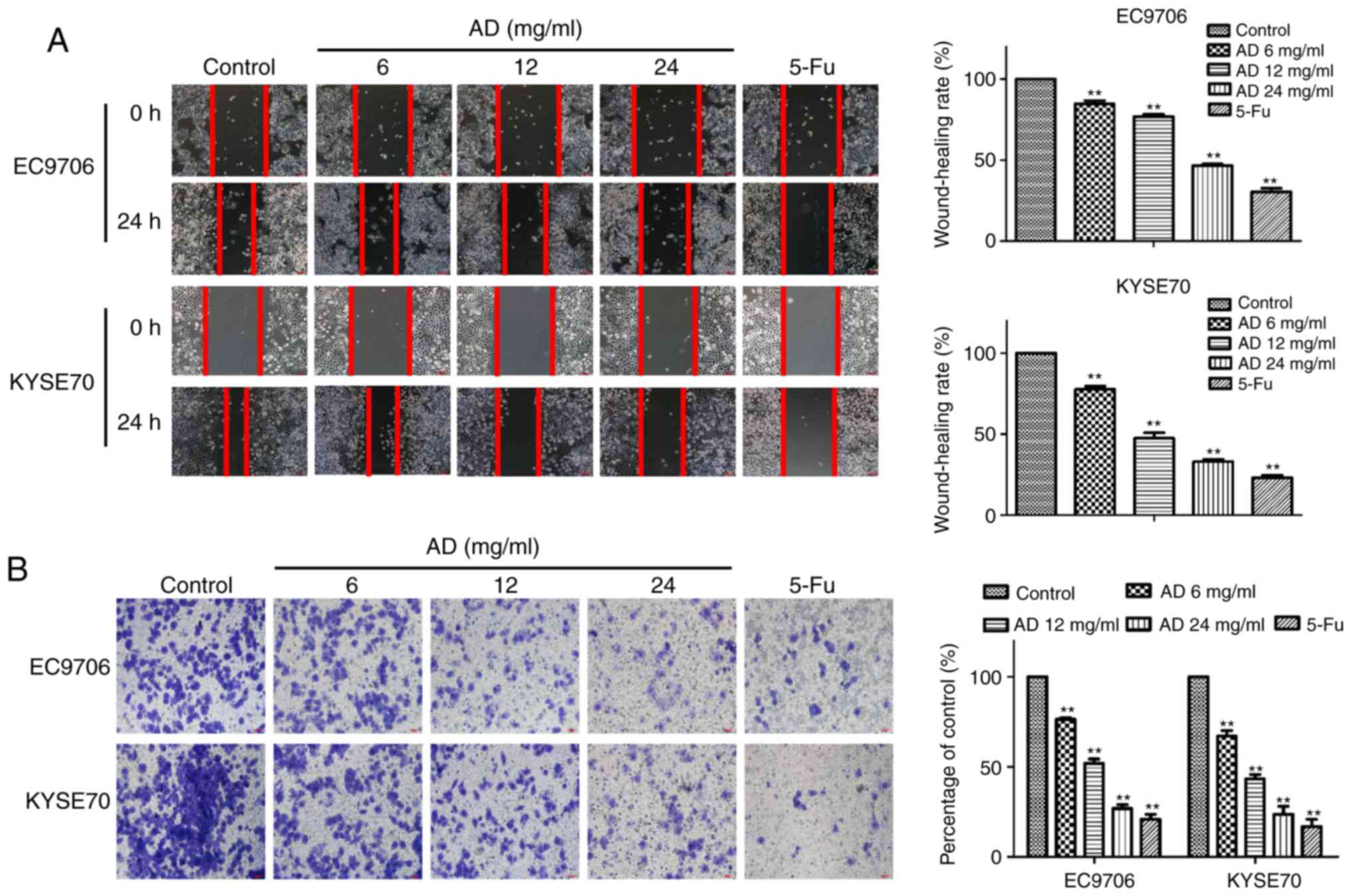 The migratory capacity of the cells was tested with a wound-healing assay. Treatment with Aidi for 24 h significantly inhibited the migration of EC9706 and KYSE70 cells in a dose-dependent manner (P<0.01; Fig. 2A). The wound-healing rates of the EC9706 cells following treatment with 6, 12 and 24 mg/ml Aidi and 32 mg/ml 5-Fu were 84.77±3.46%, 76.88±2.27%, 46.70±1.65% and 30.44±3.85%, respectively, while the wound-healing rates of the KYSE70 cells were 77.55±3.63%, 47.27±5.54%, 32.84±1.95% and 23.06±2.83%, respectively. The trends of the rates in the two cell types, with different degrees of differentiation, are consistent. The number of invading cells was significantly reduced by treatment with Aidi, in a dose-dependent manner (P<0.01; Fig. 2B). The invasion inhibition rates of treatment with 6, 12 and 24 mg/ml Aidi and 32 mg/ml 5-Fu were 76.46±1.45%, 51.97±4.15%, 26.90±3.52% and 20.85±4.86% in EC9706 cells, and 67.03±5.36%, 43.26±4.29%, 23.67±7.77% and 16.86±6.86% in KYSE70 cells, respectively. These results demonstrated that treatment with Aidi induced an inhibition of ESCC migratory and invasive capacity in a concentration-dependent manner, suggesting an inhibitory effect on metastasis.