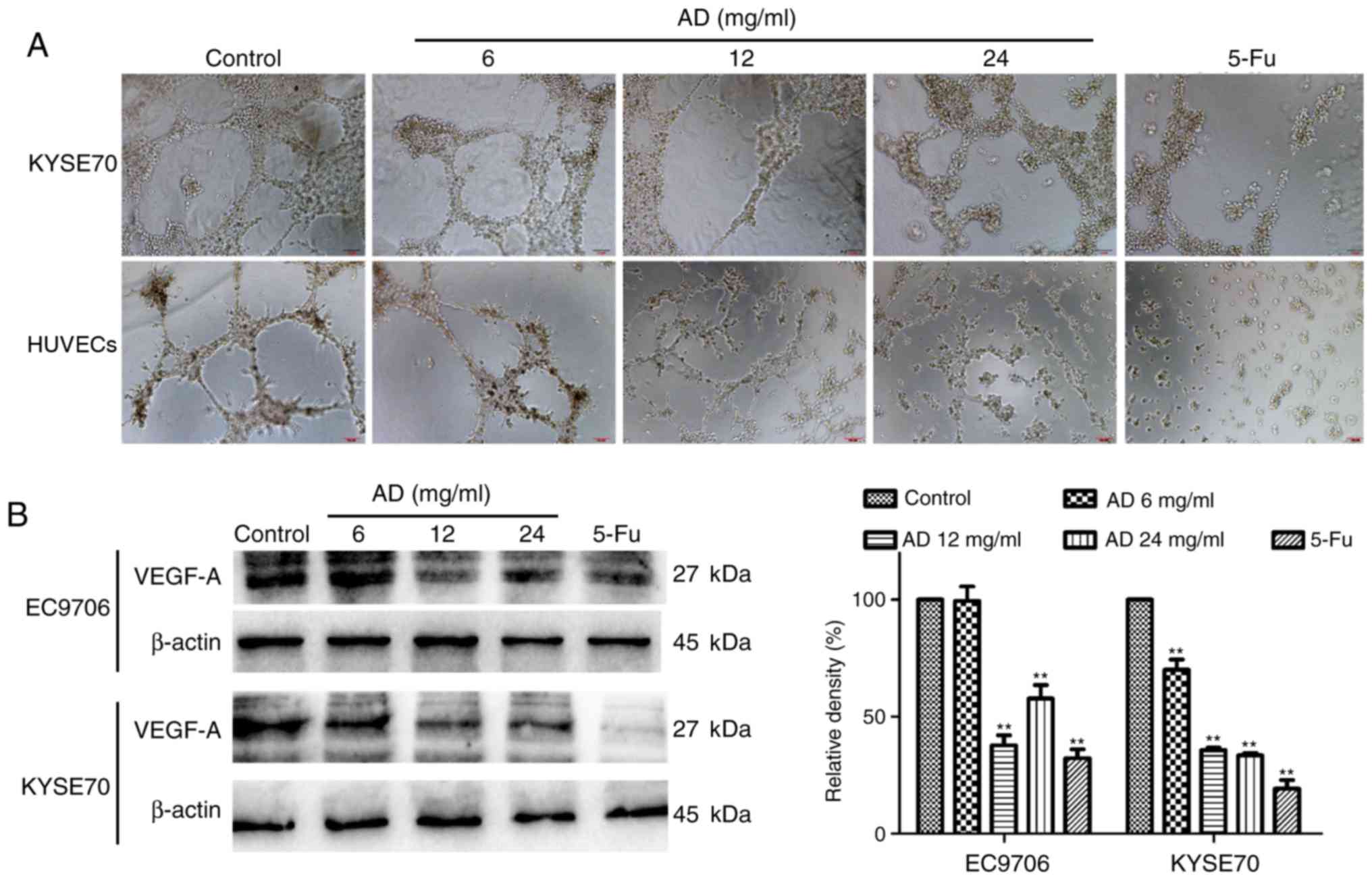 An angiogenesis assay was performed to investigate the effect of treatment with Aidi on angiogenesis in vitro. HUVECs resemble the principal constituent of tumor blood vessels; it was identified that treatment with Aidi may reduce the formation of a network of capillary-like tubes in HUVECs (Fig. 3A). To better understand the mechanism of angiogenesis, VM formation in ESCC cells was examined. As EC9706 cells are highly differentiated and less malignant, they may not form capillary-like tubes well, while KYSE70 cells have higher malignancy, and were therefore selected. The results showed treatment with Aidi downregulated VM formation in KYSE70 cells (Fig. 3A). Western blot analysis demonstrated that treatment with Aidi decreased the expression of VEGF-A in EC9706 and KYSE70 cells (Fig. 3B). These data indicated that treatment with Aidi may inhibit angiogenesis.