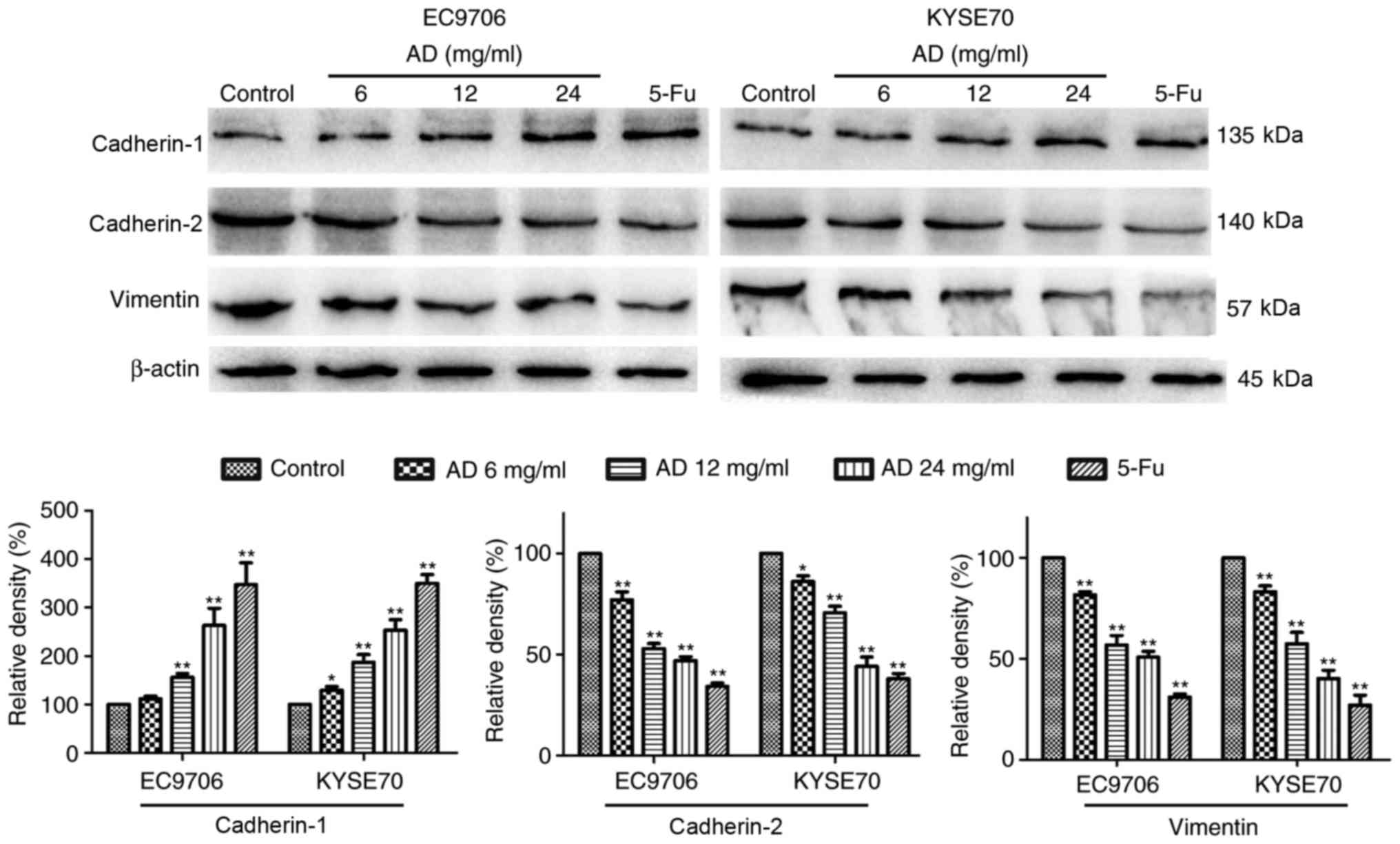 EMT signaling contributes to tumor metastasis. To investigate whether the inhibition of EMT was associated with the effects of treatment with Aidi, EMT signaling in EC9706 and KYSE70 cells was examined. The expression levels of cadherin-1, associated with epithelial morphology, were increased, while the expression of cadherin-2 and vimentin, associated with mesenchymal morphology, were decreased in a dose-dependent manner following treatment with Aidi (Fig. 4).