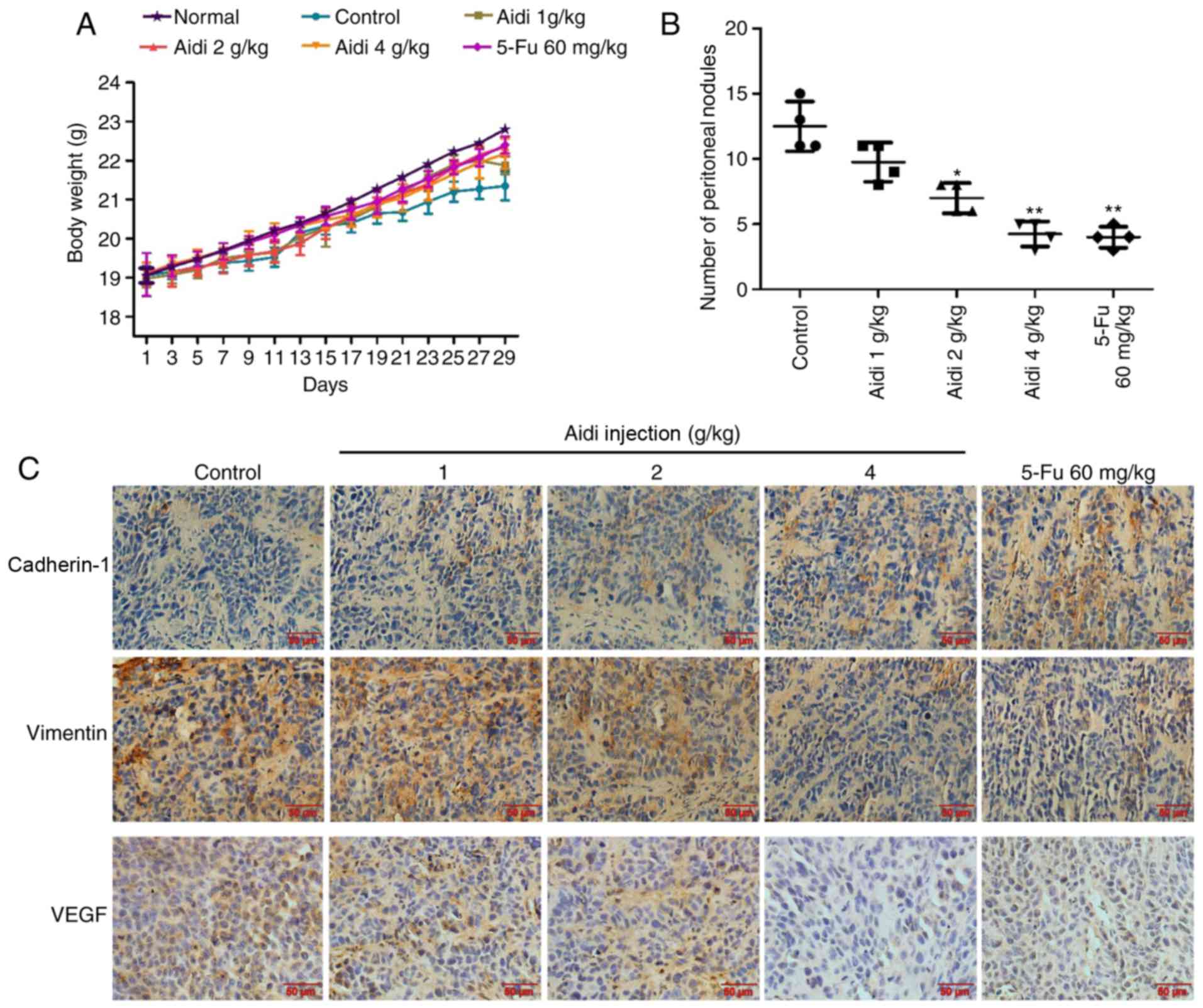 To evaluate the effects of Aidi injection on the metastasis of ESCC, a mouse abdominal tumor model was established. The weight of nude mice in the treatment groups was compared with the negative control group, which were injected with saline; there was no significant alteration (Fig. 5A), indicating that no toxicity had occurred in any of the treated groups. Aidi injection inhibited peritoneal dissemination, as the number of macroscopic tumor nodules in the Aidi injection groups was fewer compared with that in the control group (Fig. 5B). These data suggested that Aidi injection may inhibit ESCC metastasis.