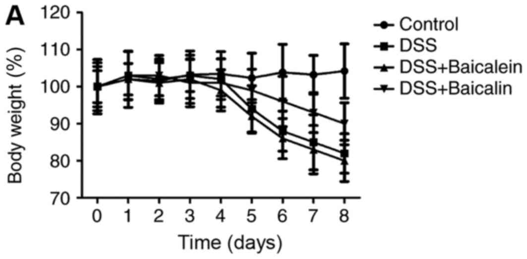 Colitis was induced in mice with 2.5% w/v DSS (MP Biomedicals, LLC, Santa Ana, CA, USA) provided ad libitum for 9 days. DSS induces mucosal damage in the colon, resulting in an influx of commensal flora to the submucosal layers; this induces an immune response that closely parallels human colitis. Control groups received tap water only, DSS group received 2.5% DSS, DSS + baicalein group received 2.5% DSS and baicalein treatment, and DSS + baicalin group was treated with 2.5% DSS and baicalin.