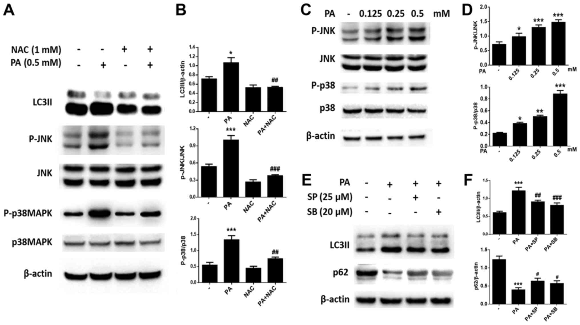 Antibodies against cleaved caspase-3 (9679S, 1:800), p62 (39749S, 1:800), JNK (9252S, 1:1,000), phospho-JNK (4668S, 1:800), p38MAPK (8690S, 1:1,000), phospho-p38 MAPK (4511S, 1:800), β-Actin (8457S, 1:3,000) and GAPDH (5174S, 1:3,000) were purchased from Cell Signaling Technology, Inc. (Danvers, MA, USA). Antibodies for LC3B-II were purchased from Abcam (ab51520, 1:3,000; Cambridge, MA, USA). Fetal bovine serum (FBS) was obtained from Gemini Bio Products (900108; Woodland, CA, USA). FA-free bovine serum albumin (BSA) was obtained from Solarbio (A8850; Beijing, China). PA (P0500), SP600125 (S5567), and SB203580 (S8307) were purchased from Sigma-Aldrich (Merck KGaA, Darmstadt, Germany). Rapamycin (RA, S1039) and 3-methyladenine (3-MA, S2767) were obtained from Selleck Chemicals (Houston, TX, USA).