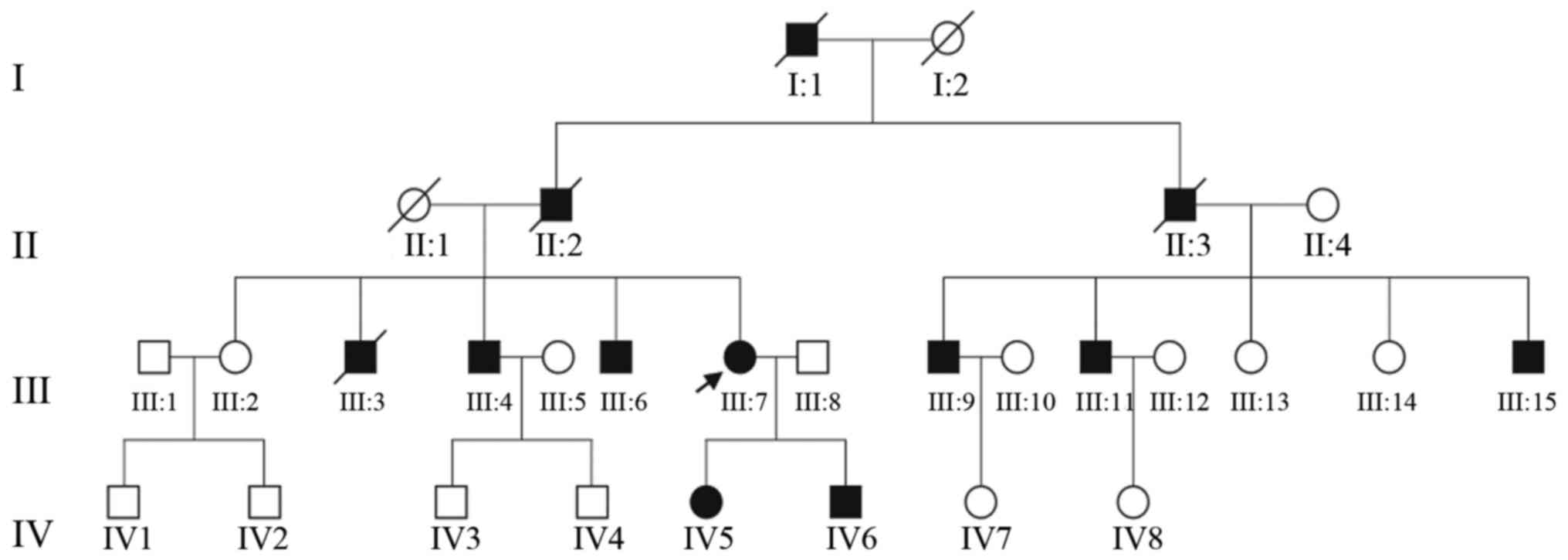 A four-generation family composed of 29 members from Sichuan Province of China was recruited in this study. Among them, I1, I2, II1, II2, and II3 were deceased before this study, their information were collected from their medical records. III3 was deceased after he participated in this study and donated his blood sample. In total, 12 family members were diagnosed with FAP according to their clinical features, family history, medical history, colonoscopy, and pathology examinations. The disease exhibited a pattern of autosomal dominant inheritance, as indicated by the familial pedigree (Fig. 1). Detailed clinical information was presented in Table I.