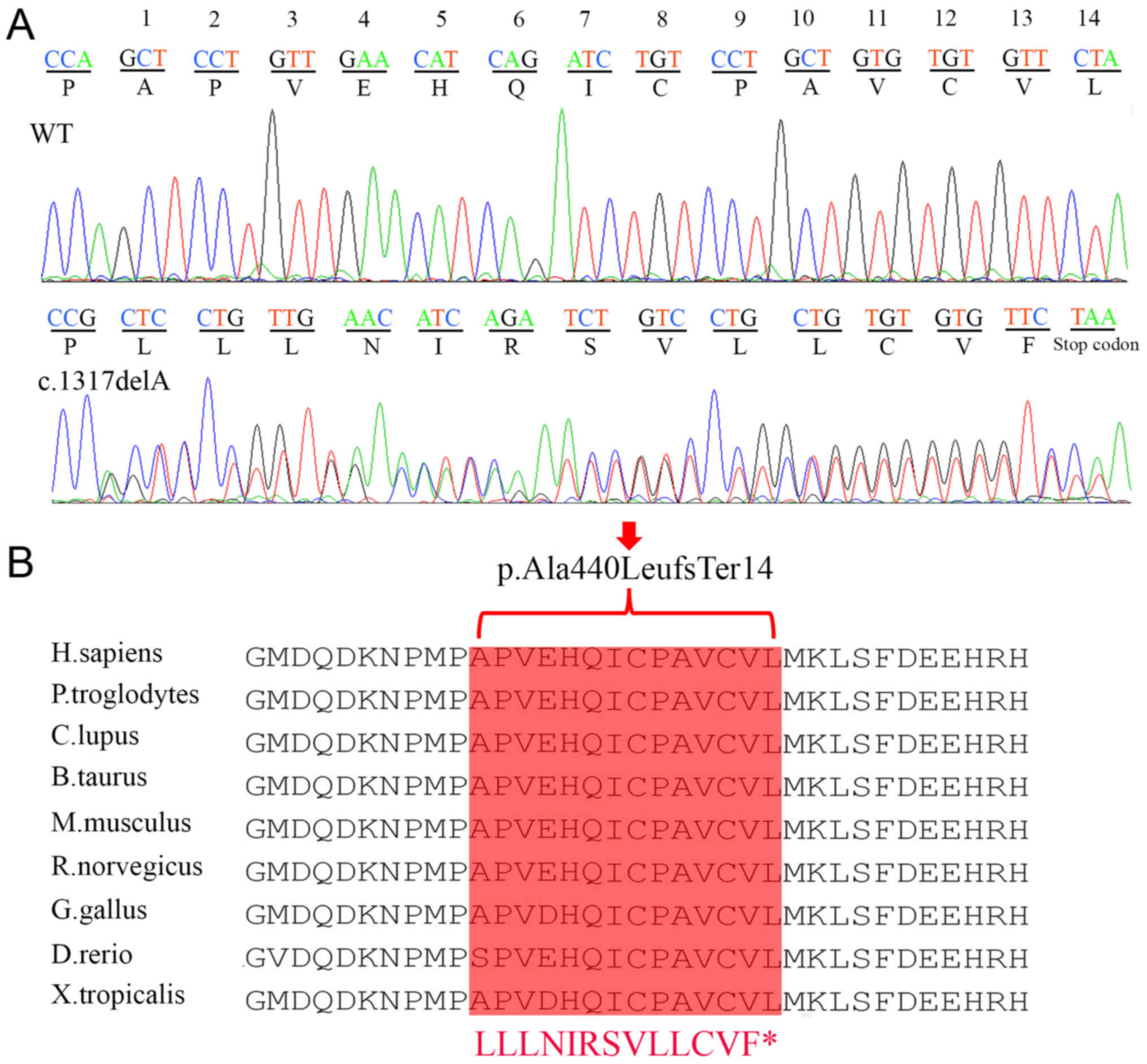 Genetic diagnosis mainly focuses on the APC gene in chromosome 5q22.2, as mutations in this gene almost account for all cases of FAP (12). The APC gene encodes a tumor suppressor protein, which is responsible for ubiquitination and degradation of β-catenin and functions as an antagonist of the Wnt signaling pathway (13,14). β-catenin is an important factor in cell cycle entry, proliferation, differentiation, migration, apoptosis, and progression. Abnormal accumulation of β-catenin and aberrant activation of Wnt/β-catenin pathway leads to progression of several major human cancers (15,16). In addition, APC also involves in other processes including cell migration and adhesion, transcriptional activation, microtubule stabilization and apoptosis. Inactivation of APC can lead to defective chromosome segregation and aberrant mitosis (17–19). In the present study, we detected a novel frame shift mutation c.1317delA (p.Ala440LeufsTer14) in the exon 10 of the APC gene in a large Chinese FAP pedigree. This mutation could result in a truncation of 2,389 amino acids downstream of APC protein. Protein tertiary structure analysis revealed that the mutated APC protein lost C-terminal helices, which was an important region to bind with β-catenin, microtubule and other elements.