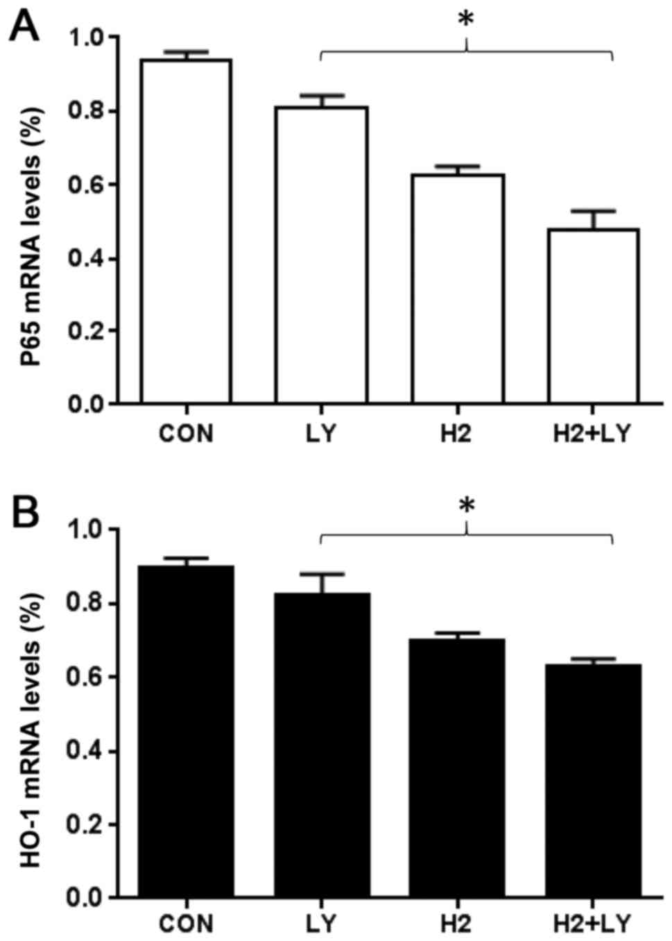 To investigate the mechanism of anti-oxidation induced by hydrogen-rich saline alone, LY294002 alone and the combination of hydrogen-rich saline and LY294002, the present study tested the effect of three treatment groups on HO-1 and NF-κB p65 protein and mRNA expression levels. Western blot analysis revealed that hydrogen-rich saline monotherapy led to a decrease in HO-1 and p65 levels as compared with the control cells (Fig. 4A and B). RT-qPCR analysis revealed that hydrogen-rich saline monotherapy led to a decrease in HO-1 and p65 mRNA expression levels, compared with the control cells (Fig. 5A and B). The protein and mRNA expression levels were higher following combined treatment with hydrogen-rich saline and LY294002, compared with treatment with either of the agents alone.