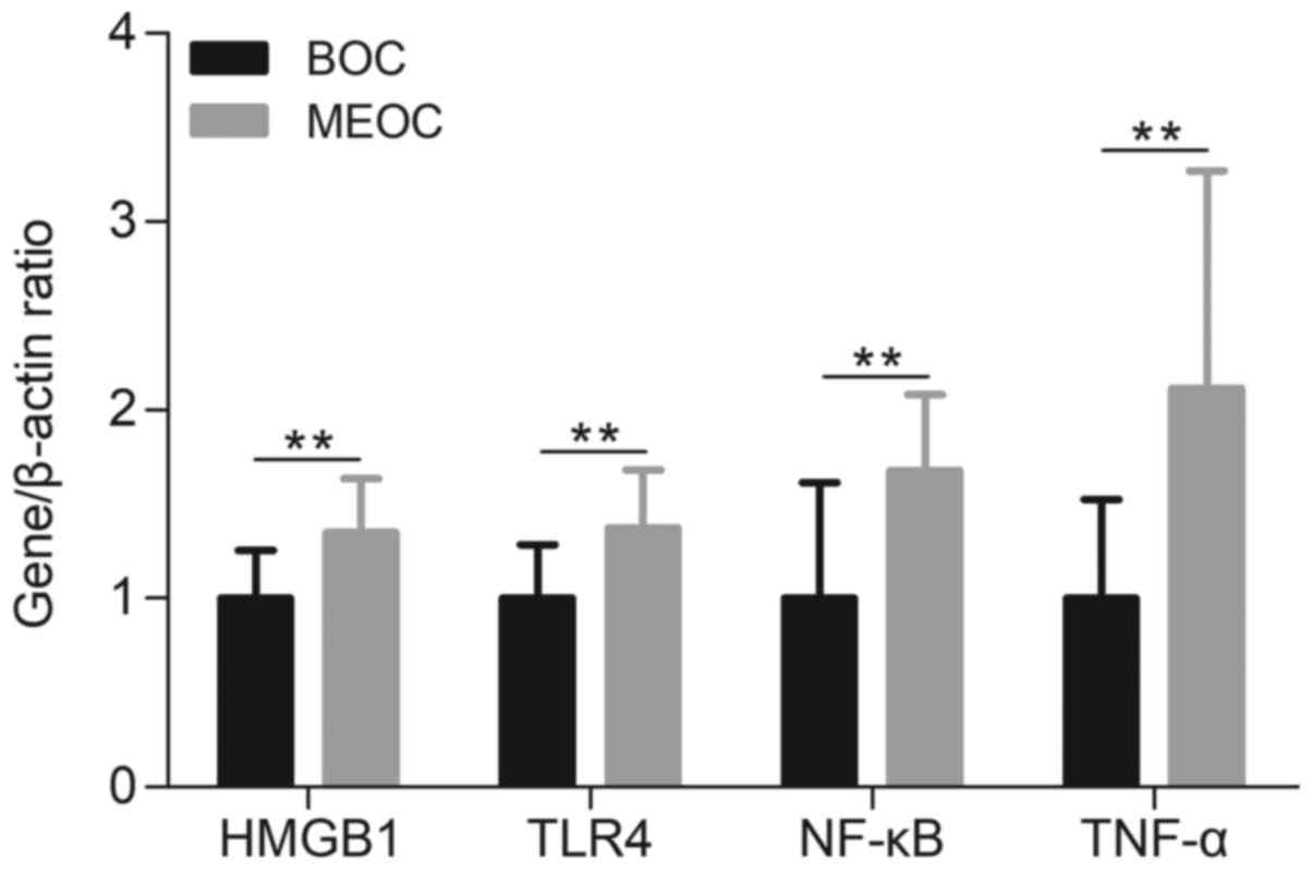 RT-qPCR analysis demonstrated that the mRNA expression of HMGB1, TLR4, NF-κB and TNF-α was significantly increased in the MEOC group, compared with the BOC group (P<0.01; Fig. 1). In addition, western blot analysis was performed to detect the protein expression of HMGB1, TLR4, NF-κB and TNF-α in the MEOC and BOC groups. As presented in Fig. 2, the protein expression of HMGB1, TLR4, NF-κB and TNF-α was significantly increased in the MEOC group, compared with the BOC group (P<0.01).
