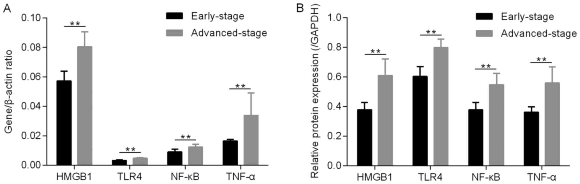 In the present study, patients with MEOC were divided into two subgroups according to the tumor stage. The gene expression levels of HMGB1, TLR4, NF-κB and TNF-α in the advanced-stage group were significantly increased, compared with the early-stage group (P<0.01; Fig. 3A). Similar results were obtained at the protein level, demonstrating that the protein expression of HMGB1, TLR4, NF-κB and TNF-α in the advanced-stage group was significantly increased, compared with the early-stage group (P<0.01; Fig. 3B).