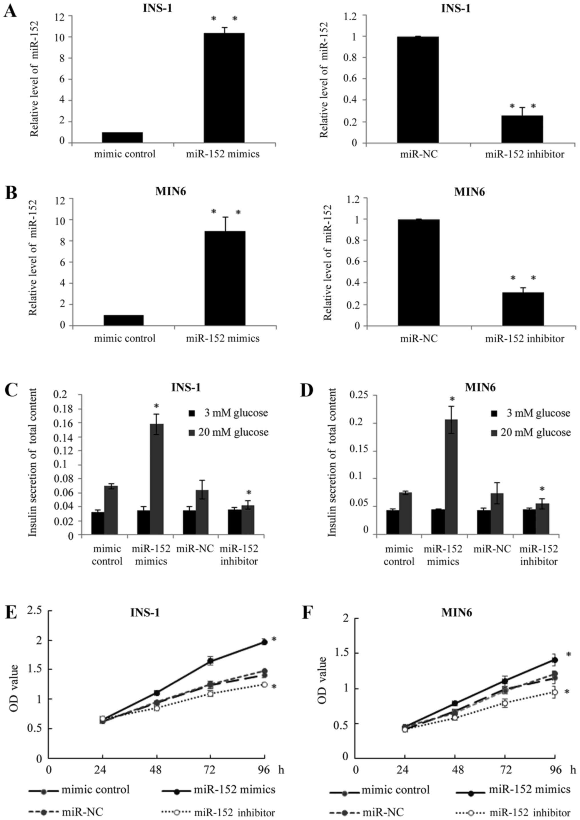 The miR-152 mimic, miR-152 inhibitor, and miRNA mimic and inhibitor controls, were purchased from Shanghai GenePharma Co., Ltd. (Shanghai, China). The miR-152 mimic, GCAGTCTCAGTGCATGACAGA, miR-152 inhibitor, CCAUCUUUACCAGACAGUGUUA, inhibitor controls CAGUACUUUUGUGUAGUAC. HiPerFect transfection reagent (Qiagen GmbH, Hilden, Germany) was used for the transfection of miR-152 mimic and inhibitors, and controls. MIN6/INS-1 cells were cultured by plating 6×105 cells into 100-mm Petri dishes. A total of 250 pmol miR-152 mimic or inhibitor, or respective controls were transfected into cells. At 48 h following transfection, the expression of miR-152 and target genes were detected reverse transfection-quantitative polymerase chain reaction (RT-qPCR). Insulin (1 nmol/l) was purchased from United States Biological (Salem, MA, USA).