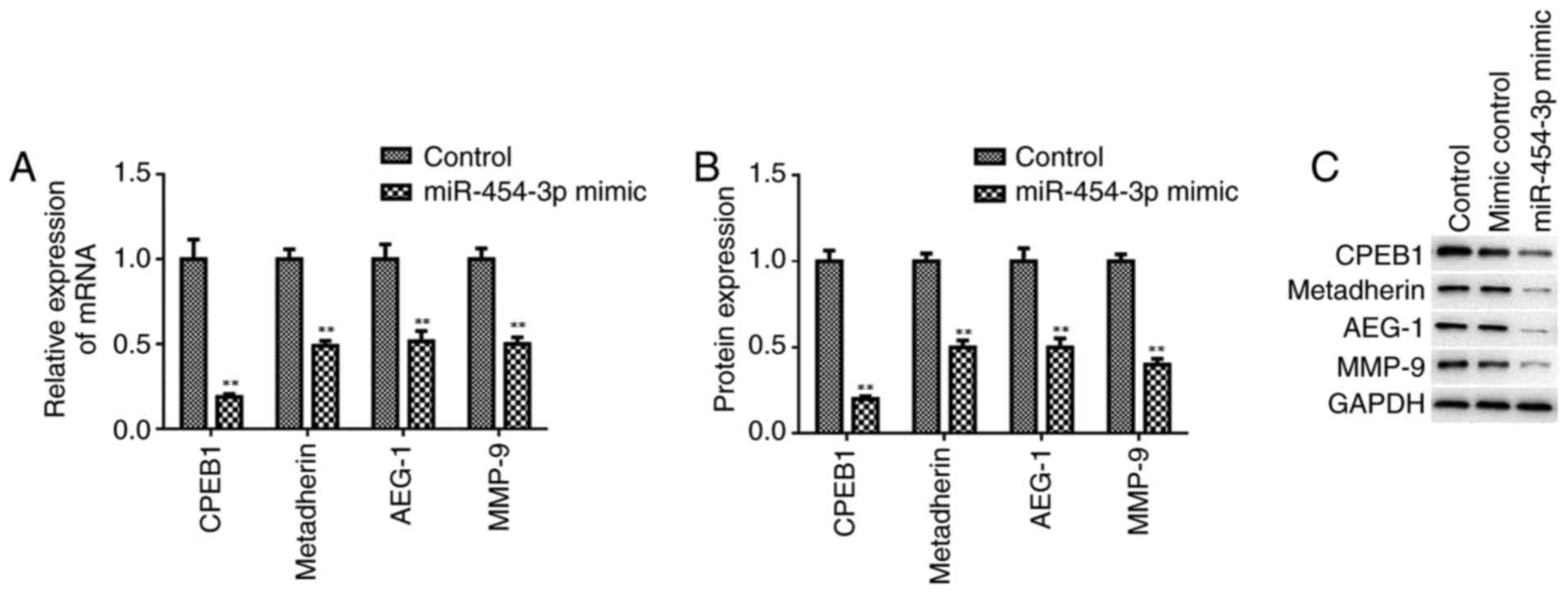Metadherin has been reported to regulate mesenchymal marker protein expression in numerous types of tumor and to promote cancer metastasis (28–30). Additionally, AEG-1 has been reported to serve a pivotal oncogenic role in tumorigenesis (31,32), and MMPs, a family of zinc-binding proteins, including MMP-9, have been demonstrated to serve important roles in tumor cell invasion and metastasis due to their ability to degrade the extracellular matrix (33,34). In the present study, western blotting and RT-qPCR revealed that miR-454-3p significantly decreased the protein and mRNA expression levels of CPEB1, metadherin, AEG-1 and MMP-9 compared with in the control group (Fig. 5).