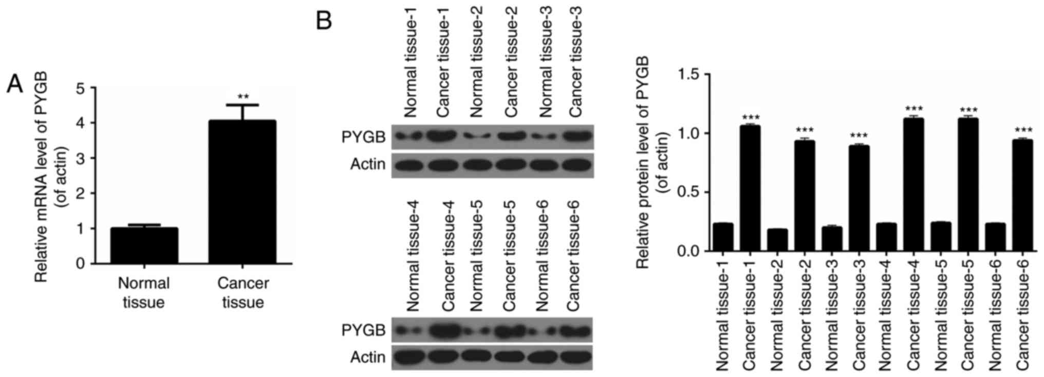 However, further study is required to confirm the role of PYGB in prostate cancer. For example, the data of the present study would be supported by PYGB overexpression experiments, to further examine its effect on the growth and apoptosis of prostate cancer cells in vitro, or by exploring the effect of PYGB on prostate cancer progression in vivo. Furthermore, studies with larger sample sizes should be performed.