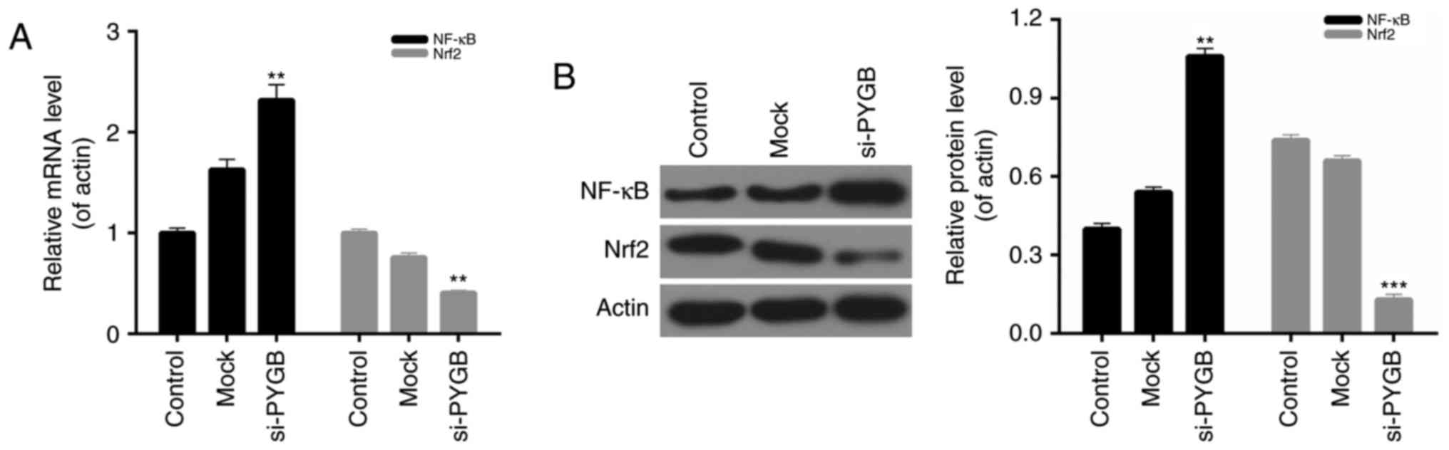 The present study also evaluated the expression of NF-κB and Nrf2 in PC3 cells from each group. The RT-qPCR and western blotting results indicated that the mRNA and protein expression levels of NF-κB in PC3 cells transfected with si-PYGB were significantly higher than the control and mock groups. However, a decrease in Nrf2 expression was observed in the PC3 cells treated with si-PYGB (Fig. 6; P<0.01). Therefore, it was concluded that the NF-κB/Nrf2 signaling pathway in PC3 cells may be affected by PYGB silencing.