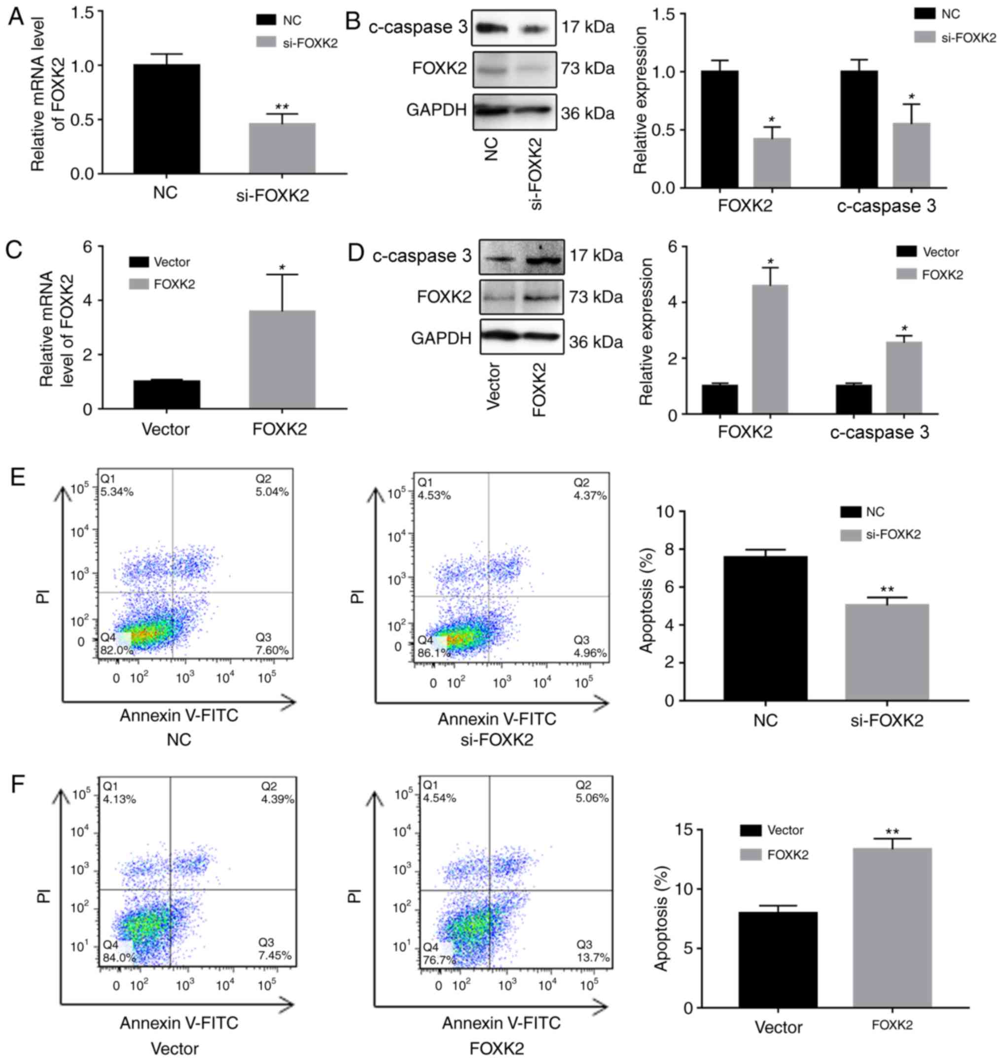 To investigate the functions of FOXK2, FOXK2 was downregulated in BGC-823 cells using siRNA, and FOXK2 was upregulated using a FOXK2 plasmid. Alterations in the expression of FOXK2 were verified by RT-qPCR and western blotting. Western blot analysis revealed that increased FOXK2 expression reduced the upregulation of cleaved caspase-3 (Fig. 2A-D).