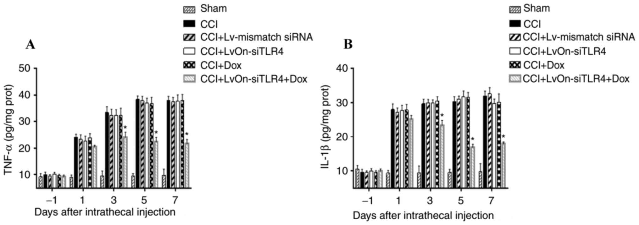 Rats were randomly divided into 6 groups (n=30 per group): A sham group [Sham surgery + normal saline (NS)], a CCI group (CCI surgery), an Lv-mismatch group (CCI + Lv-mismatch), an LvOn-siTLR4 group (CCI + LvOn-siTLR4 + NS), a Dox group (CCI + Dox) and an LvOn-siTLR4 with Dox group (CCI + LvOn-siTLR4 + Dox). The lentivirus Lv-mismatch expressing scrambled siRNA (TTCTCCGAACGTGTCACGT) was used as a control. Following CCI, rats in the LvOn-siTLR4 and LvOn-siTLR4 with Dox groups were administered the LvOn-siTLR4 virus (1×107 TU/10 µl) intrathecally. The same titer of Lv-mismatch was applied intrathecally to the Lv-mismatch group. NS of equal volume was administered intrathecally to the rats of the NS groups. In the Dox and LvOn-siTLR4 with Dox groups, Dox was given orally in water (200 ng/ml).