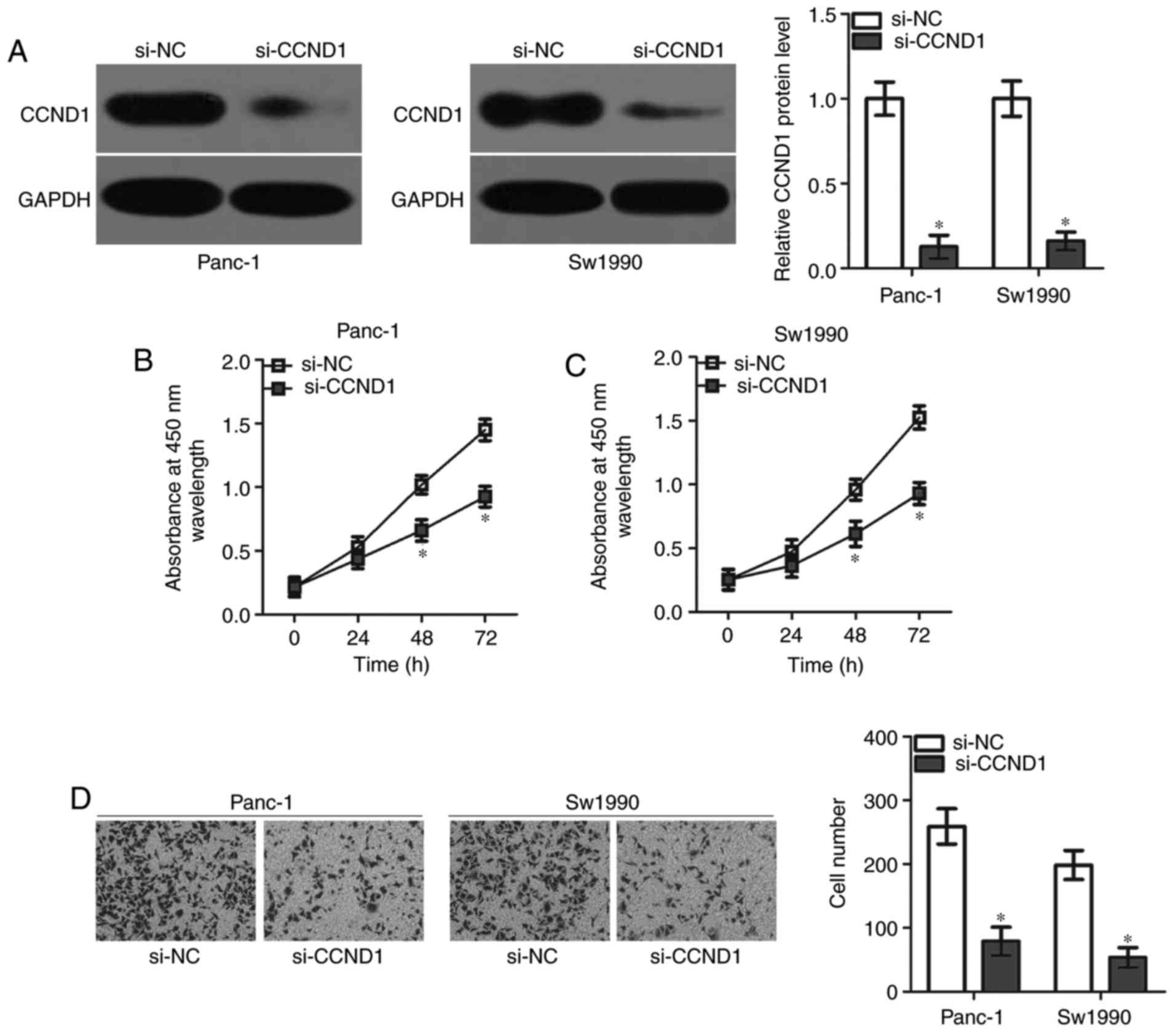To elucidate the roles of CCND1 in pancreatic cancer, a knockdown of endogenous CCND1 expression was performed in Panc-1 and Sw1990 cells via transfection with si-CCND1. Western blot analysis demonstrated that the CCND1 protein was significantly downregulated in Panc-1 and Sw1990 cells following transfection with si-CCND1 (Fig. 4A). Functional experiments indicated that the inhibition of CCND1 decreased the proliferative (Fig. 4B and C) and invasive ability (Fig. 4D) of Panc-1 and Sw1990 cells, mimicking miR-584 overexpression. The present results suggested that miR-584 directly targeted CCND1 in pancreatic cancer cells.