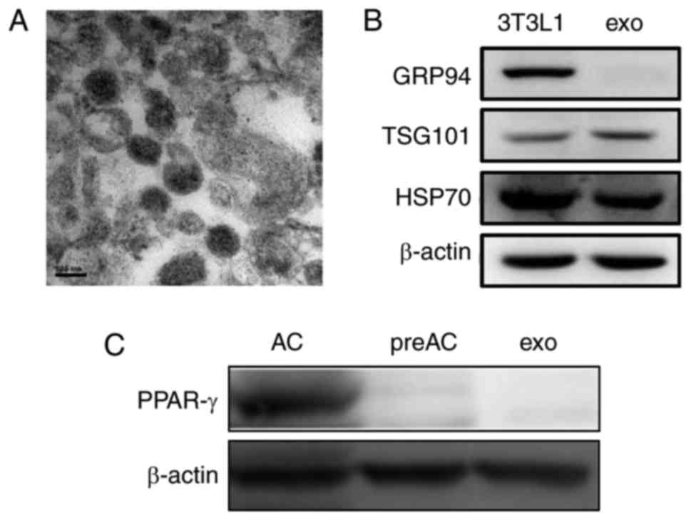 Exosomes were isolated from 3T3L1 cells cultured under normal growth conditions (3T3L1-exo). Exosome size and morphology were determined using electron microscopy. Exosomes were revealed to range between 50 and 100 nm in size, and exhibited a typical rounded shape (Fig. 1A). Like their parent 3T3L1 cells, 3T3L1-exo was revealed to express specific markers, including TSG101 and HSP70, whereas GRP94, endoplasmic reticulum-residing protein, was absent in 3T3L1-exo (Fig. 1B). Similar to their cell counterparts, 3T3L1-exo did not express the adipogenic transcription factor PPAR-γ; however, differentiated 3T3L1 cells did express PPAR-γ (Fig. 1C). These results confirmed the integrity of 3T3L1-exo.
