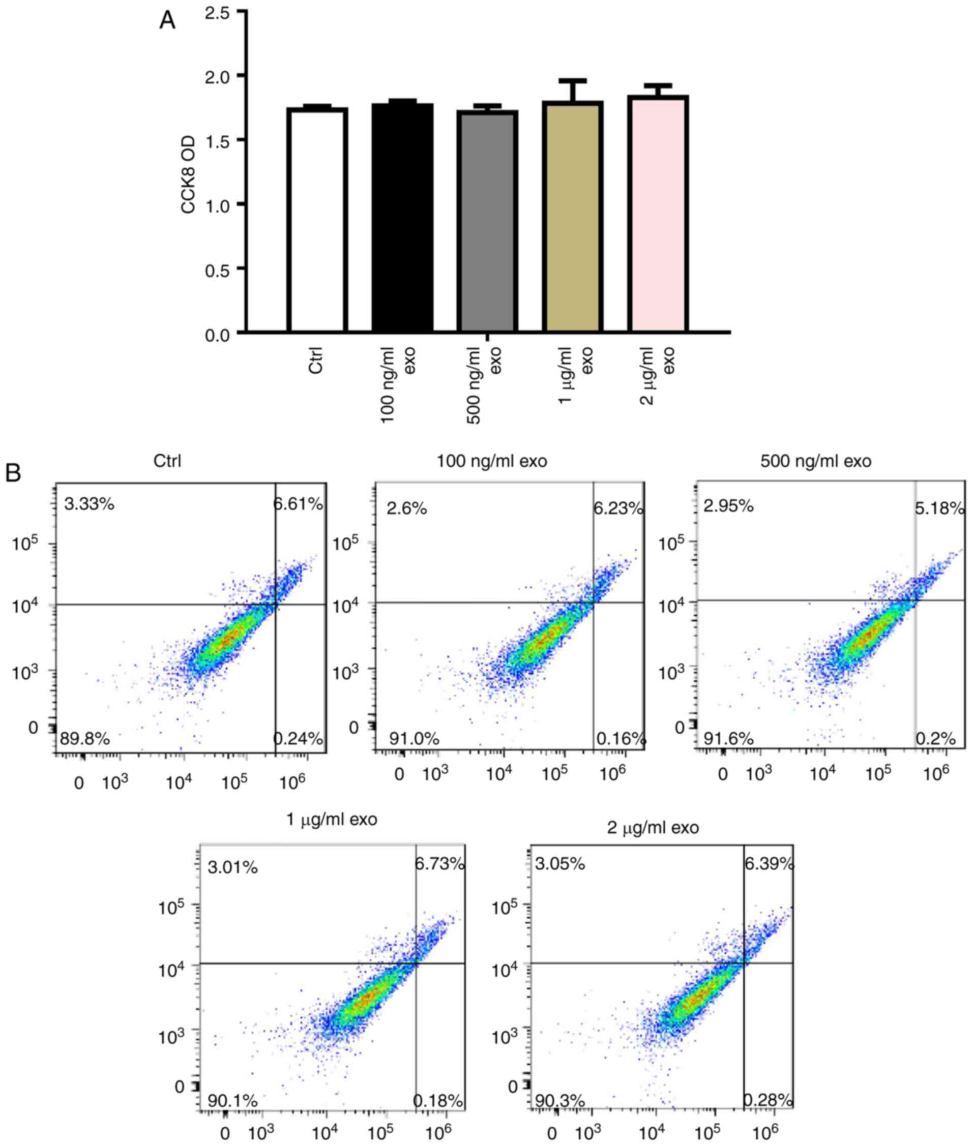 To determine the effects of 3T3L1-exo on 3T3L1 cell survival, 3T3L1 preadipocyte proliferation and apoptosis were detected following stimulation by 3T3L1-exo. Exosomes did not affect 3T3L1 cell proliferation, even with an increased concentration (Fig. 2A). Comparably, 3T3L1-exo had no effect on the apoptosis of 3T3L1 cells (Fig. 2B).