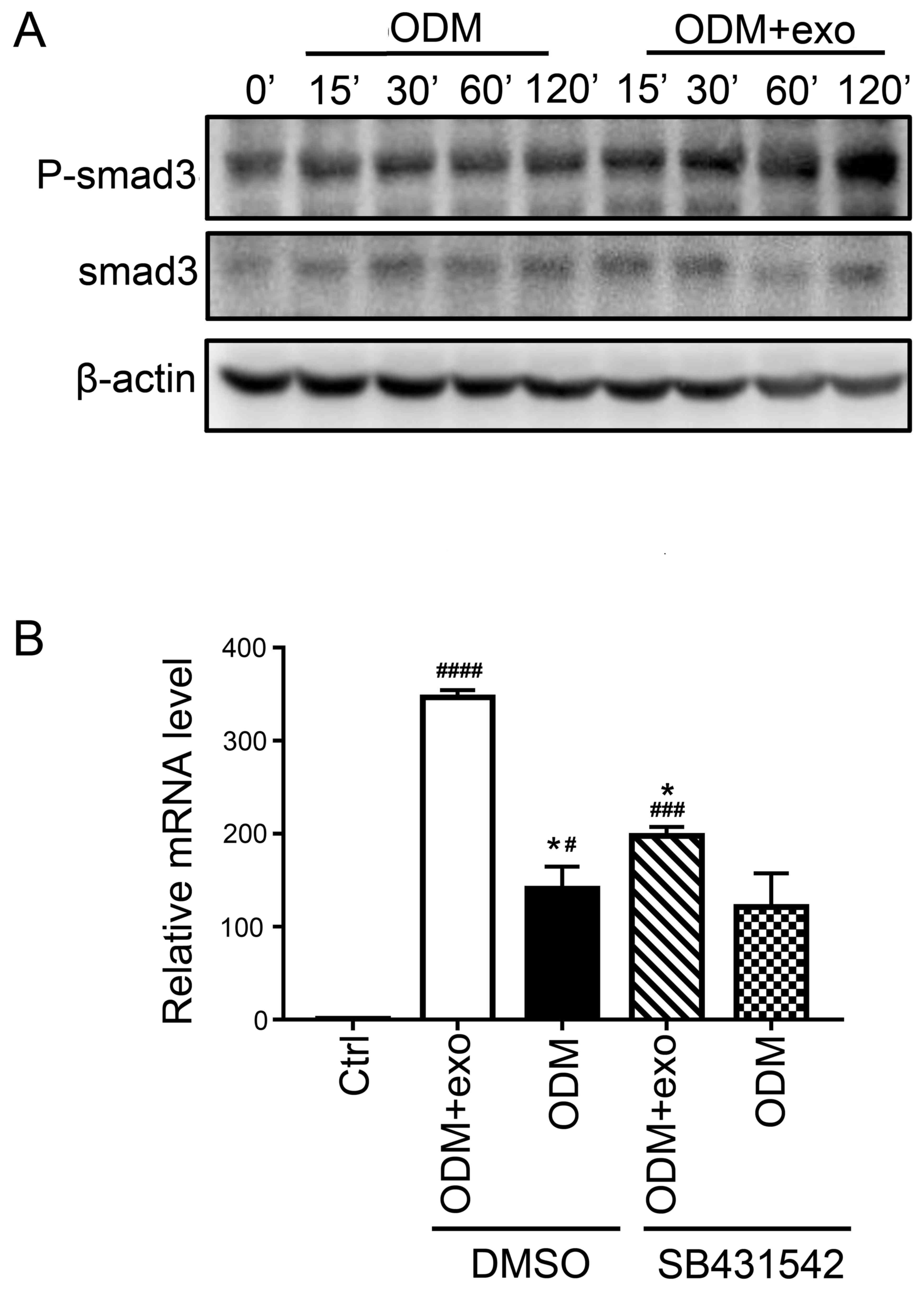 The present findings suggested that 3T3L1-exo promoted the osteogenic differentiation of 3T3L1 cells. RUNX2 activates and regulates osteogenesis and acts as a target gene for numerous signaling pathways, including TGF-β1, bone morphogenetic protein, Wnt, Hedgehog and Nel-like protein type-1 (5). The present study demonstrated that exposure of cells to 3T3L1-exo induced Smad3 phosphorylation (Fig. 4A). Subsequently, the mRNA expression levels of RUNX2 were detected, and it was revealed that there was no significant difference between the ODM + exo and ODM groups when TGF-β was inhibited through a Smad3 inhibitor (SB431542; Beyotime Institute of Biotechnology, Shanghai, China) (Fig. 4B). These results indicated that 3T3L1-exo may promote 3T3L1 cell osteogenic differentiation via the TGF-β1 pathway.