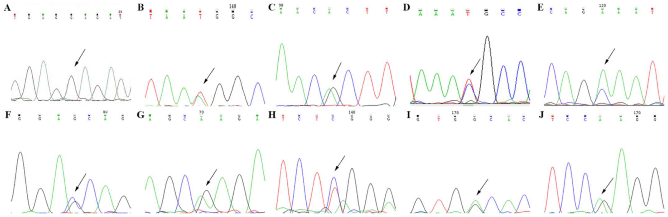 Finally, Sanger sequencing verified each mutation (Fig. 3), which was followed by review of the literature in the context of each mutation to obtain the genetic diagnosis (8,21–23). The parents of certain patients were also studied through the use of Sanger sequencing, but the identified gene mutations were not detected in any of the parents (data not shown).