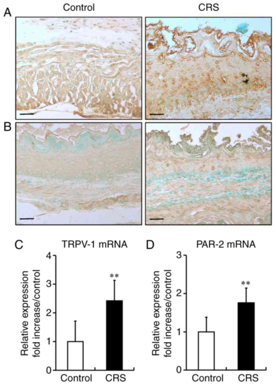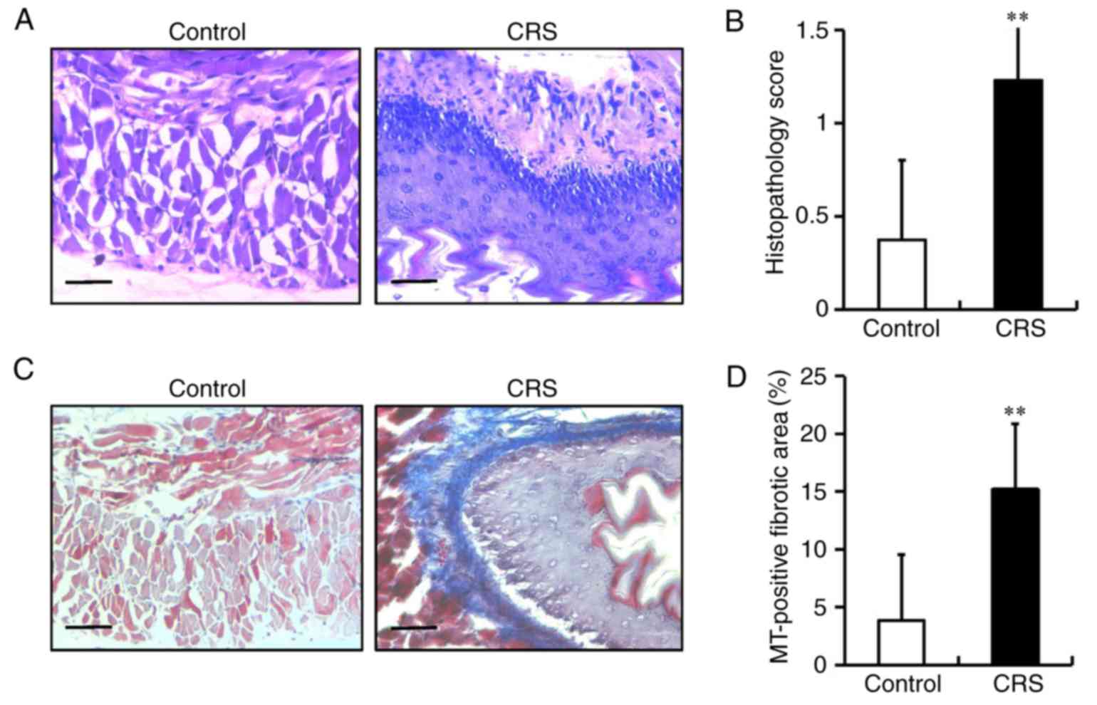 In the current study, 8-week-old male C57BL/6J mice were subjected to restraint stress for 2 weeks to observe the stress-induced inflammatory response in the esophagus. The histopathological analysis by H&E staining revealed that pathological changes in the esophagus were not observed in the control group. In the esophagus of the CRS group, however, mild infiltration of inflammatory cells in the submucosa, basal cell hyperproliferation, papillary hypertrophy, epithelial hyperkeratinization, squamous cell expansion and an increase in the number of fibrin cells were observed (Fig. 1A). The mucosal damage scores in the esophageal tissue of mice are displayed in Fig. 1B. Compared with the control group, the histological damage score in the CRS group was markedly increased (0.38±0.09 in the control vs. 1.23±0.05 in the CRS group; P<0.01). These results were consistent with the typical histological findings associated with low-grade reflux esophagitis (26). In addition, the MT staining results revealed that stress increased esophageal interstitial fibrosis as compared with the control mice (Fig. 1C and D).