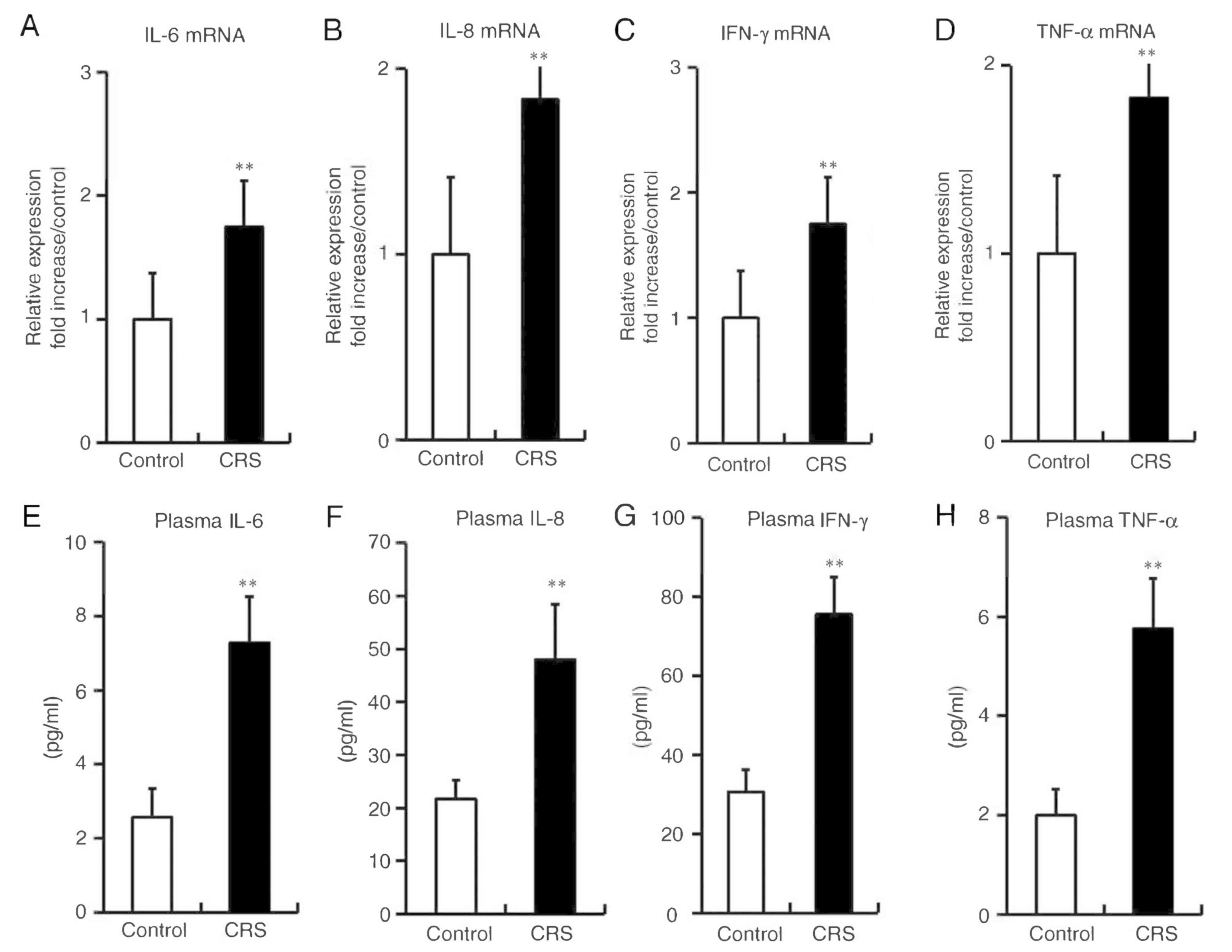 After 2 weeks of restraint stress, significant increases were observed in the mRNA expression levels of IL-6, IL-8, IFN-γ and TNF-α in the esophageal tissues of the CRS group, as compared with those in the non-stressed control group (Fig. 4A, B, C and D). Furthermore, the plasma concentration levels of IL-6, IL-8, IFN-γ and TNF-α were significantly elevated in stressed mice, in parallel with the changes in mRNA expression in the esophagus (Fig. 4E, F, G and H).