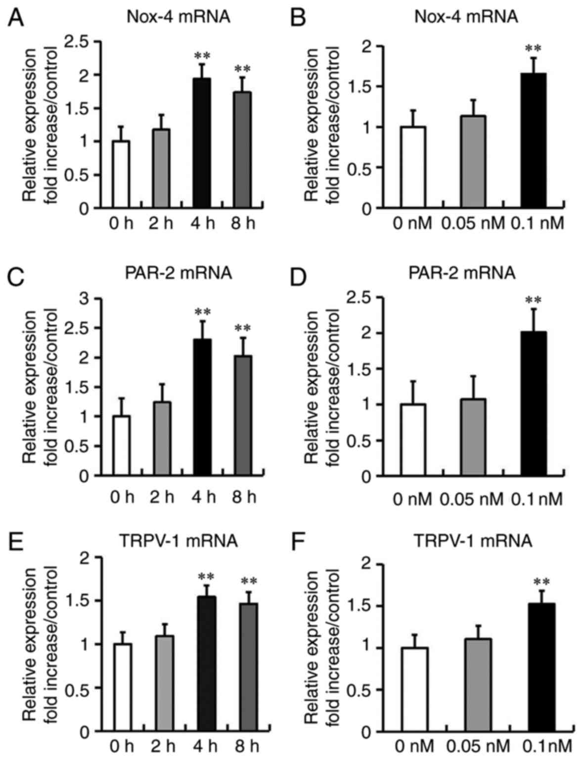 Reflux of proteases, including trypsin, has been previously reported to cause damage to the esophageal mucosa (16,18); however, the mechanism underlying this effect remains unclear. In the present study, the effect of trypsin on the expression levels of Nox-4, PAR-2 and TRPV-1 were investigated. HEECs were incubated with trypsin at the indicated concentrations and time periods. Nox-4, PAR-2 and TRPV-1 expression levels were examined at 4 h after incubating with different concentrations of trypsin (0, 0.05 and 0.1 nM), or at the different time points (0, 2, 4 and 8) following incubation with trypsin (0.1 nM). It was observed that trypsin increased the mRNA expression levels of Nox-4, PAR-2 and TRPV-1 in HEECs in a time- and dose-dependent manner (Fig. 5A-F). Trypsin at a concentration of 0.1 nM was used in subsequent in vitro experiments.